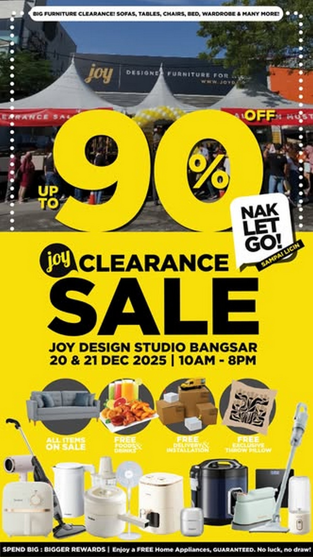 Joy Design Studio’s clearance sale continues to be one of the most anticipated home furnishing events in Kuala Lumpur. Once again, they are offering generous discounts, exciting rewards, and thoughtful perks to make shopping enjoyable. If there was ever a time to refresh your living space or pick up long-delayed items, this would be the perfect opportunity. Make your way to Bangsar on 20 or 21 December, arrive early, and see what treasures await. You may walk out pleasantly surprised, especially with the level of savings offered this year.