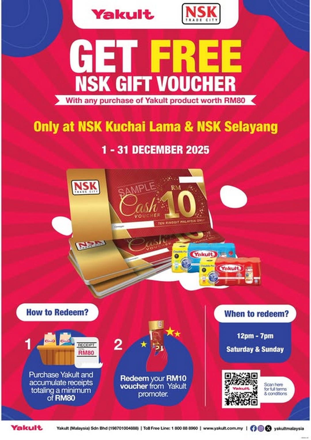 For the whole of December 2025, NSK Trade City is running a simple yet rewarding promotion that turns routine grocery shopping into instant savings. Shoppers who purchase Yakult products worth RM80 will receive an NSK Cash Voucher worth RM10 for free. The voucher can then be used on future purchases, including kitchen essentials and household items. It is a straightforward deal with real value, especially for shoppers who already include Yakult in their weekly or monthly grocery list.