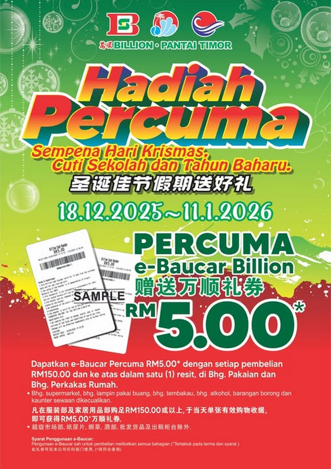 In summary, this holiday season promotion at Billion Malaysia, Timor Beach, offers more than just a free RM5 e-Voucher. It’s a thoughtfully timed, straightforward, and valuable deal that enhances the overall shopping experience. Whether shoppers are buying gifts, home essentials, or personal items, they are rewarded for spending wisely. The convenience of the location, the variety of eligible products, and the cumulative benefits of multiple visits make it a promotion worth participating in. Don’t miss the chance to make the most of this holiday season – plan a visit, enjoy the shopping experience, and leave with both your purchases and a free voucher in hand.