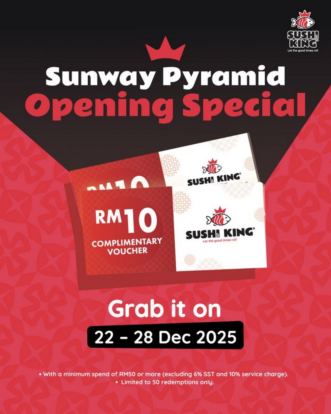 In addition to the immediate free sushi, customers can also receive an RM10 voucher as a token of appreciation for their support. To claim this voucher, diners need to spend a minimum of RM50 in a single receipt (excluding 6% SST and 10% service charge). Like the free sushi offer, this promotion is limited to the first 50 redemptions per day, making it a highly sought-after reward during the grand opening week. This voucher allows visitors to enjoy more of Sushi King’s offerings at a reduced cost, providing an excellent incentive to return for future visits.
