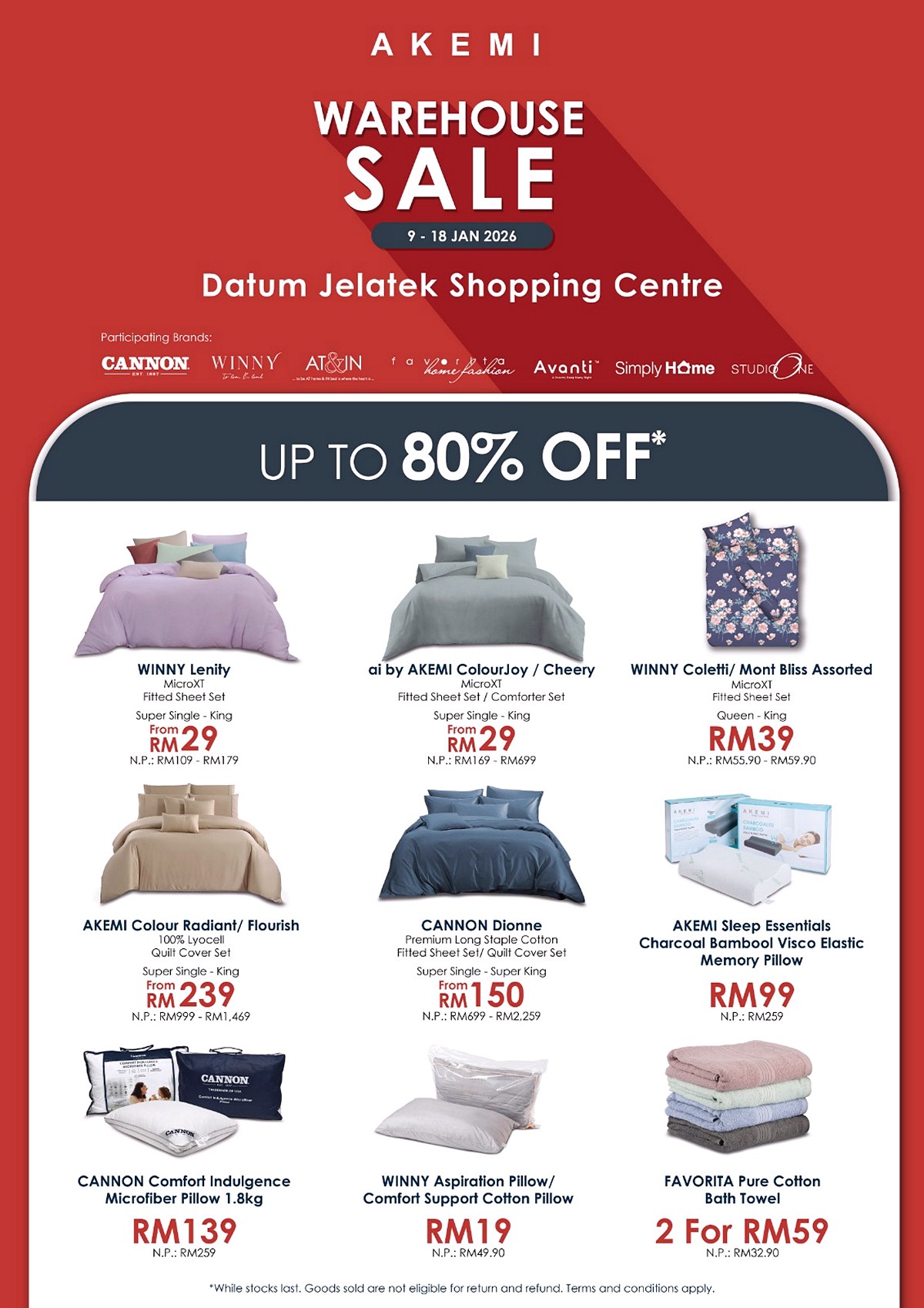 Bedding is one of the strongest highlights here. The selection includes fitted sheet sets, comforter sets, bolster covers and pillowcases suitable for everyday use. Shoppers will find products from AKEMI alongside other well-known brands such as CANNON, WINNY, AT&IN, Avanti, Simply Home and Studio One. These are familiar names in Malaysian households, now offered at warehouse-level pricing rarely seen in shopping malls.