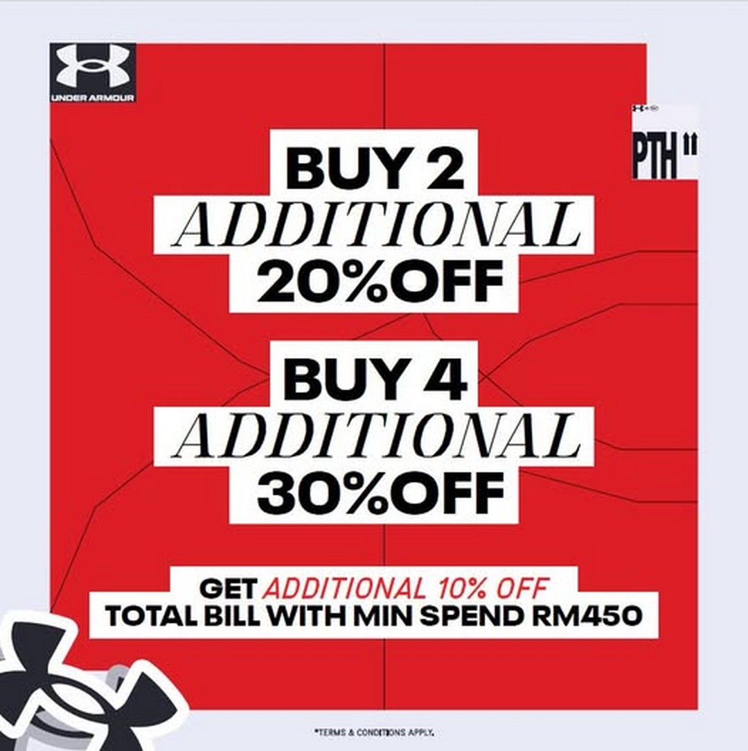 The promotion is simple yet effective. Customers purchasing two items receive an additional 20% off, while those going bigger with four items enjoy a generous 30% extra discount. But the savings do not stop there. For those spending a minimum of RM 450, an extra 10% off the total bill is applied, allowing for even greater value on premium Under Armour products.