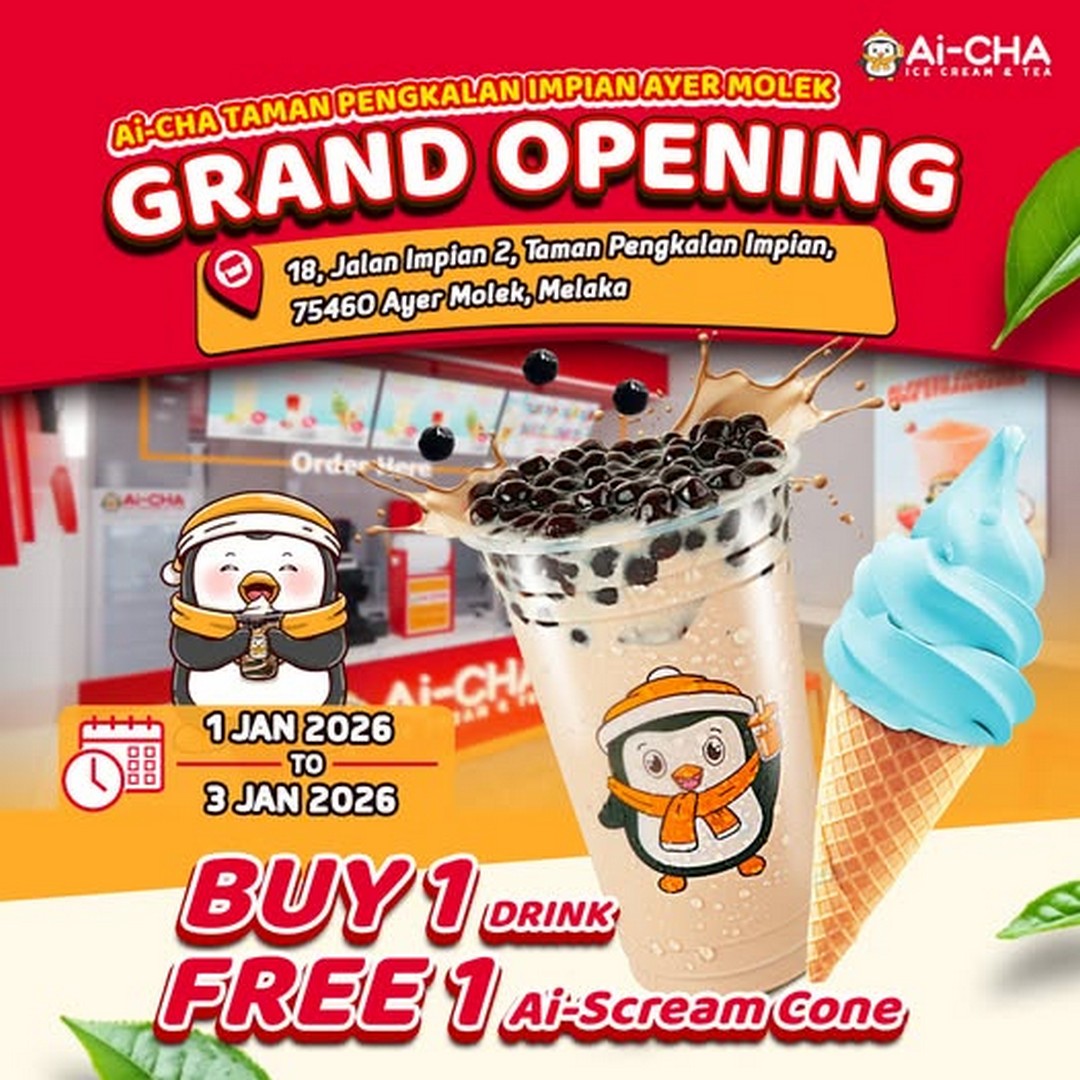 There is always something special about discovering a brand-new café in the neighbourhood, especially when it comes with a celebration that rewards early visitors. As the new year begins, Ai-CHA Malaysia is giving Melaka residents and visitors a refreshing reason to step out and treat themselves. From 1 to 3 January 2026, Ai-CHA Taman Pengkalan Impian Ayer Molek is officially opening its doors, and they are marking the occasion with a simple but delightful promotion that many people will appreciate: a complimentary ice cream cone with any drink purchase.