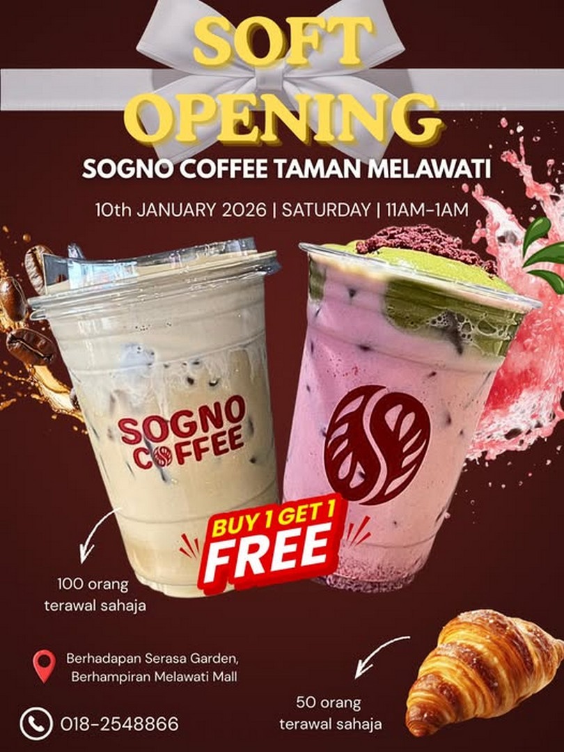 In conclusion, the opening of Sogno Coffee’s Taman Melawati branch is not just another café launch; it’s an event crafted for the community, for coffee lovers, and for anyone who enjoys quality treats combined with great deals. The Buy 1 Free 1 water offer and free mini croissants are excellent ways to kick off the day, but the real value lies in the overall experience: the chance to enjoy a cup of expertly prepared coffee in a brand-new, thoughtfully designed space, surrounded by people who share the same appreciation for quality and flavour.