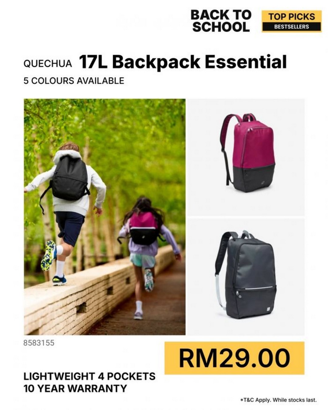 For younger students or those who prefer something compact, the QUECHUA 17L Backpack Essential is a practical choice. Available in five attractive colours, this lightweight bag comes with four pockets to keep books, stationery, and personal items neatly organised. And at just RM29, it’s an affordable yet high-quality option for students.