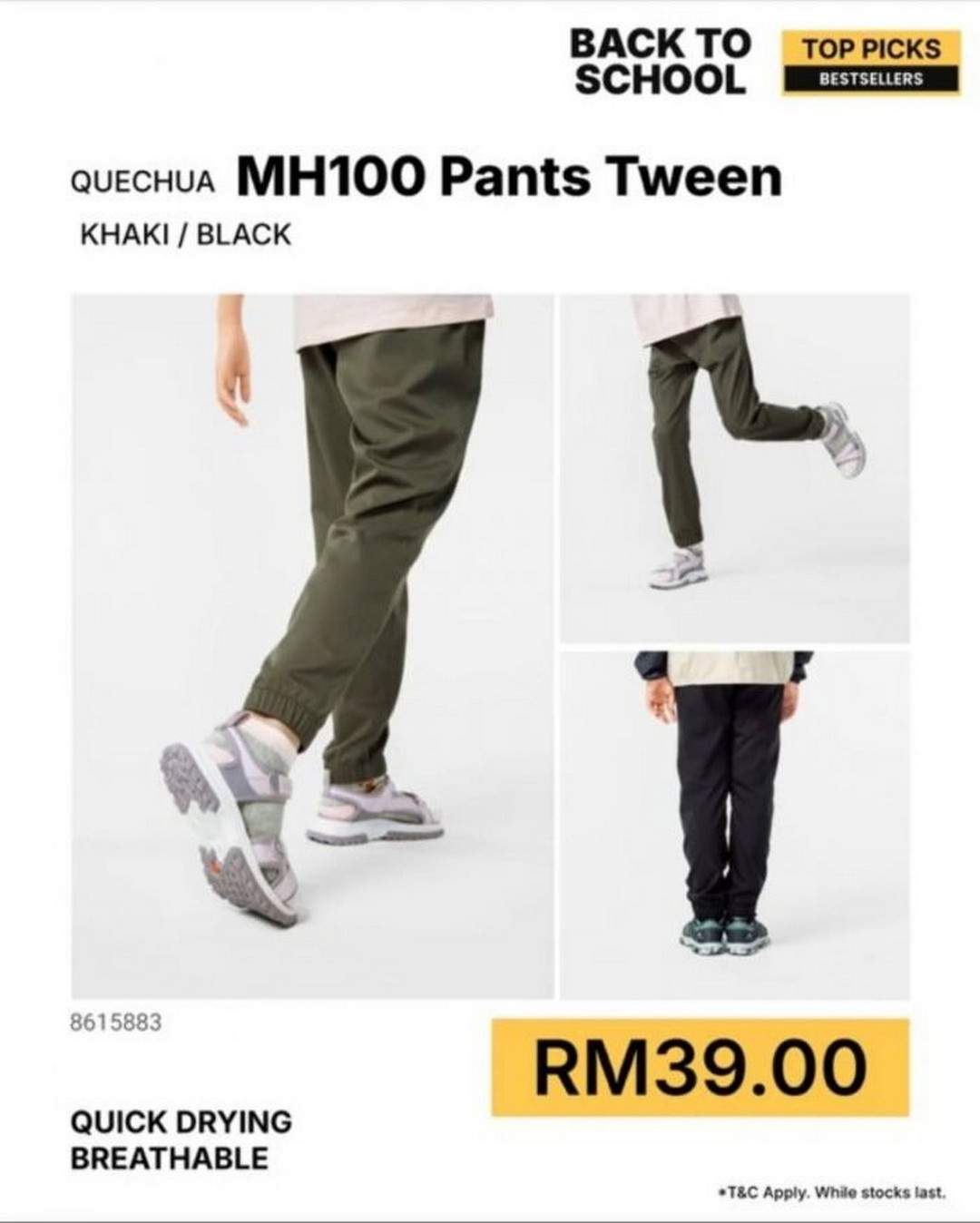 To complement the footwear, Decathlon’s QUECHUA MH100 Pants Tween are quick-drying and breathable, making them ideal for an active school day. Available in Khaki and Black, these trousers are priced at RM39, offering excellent durability and comfort without breaking the bank.