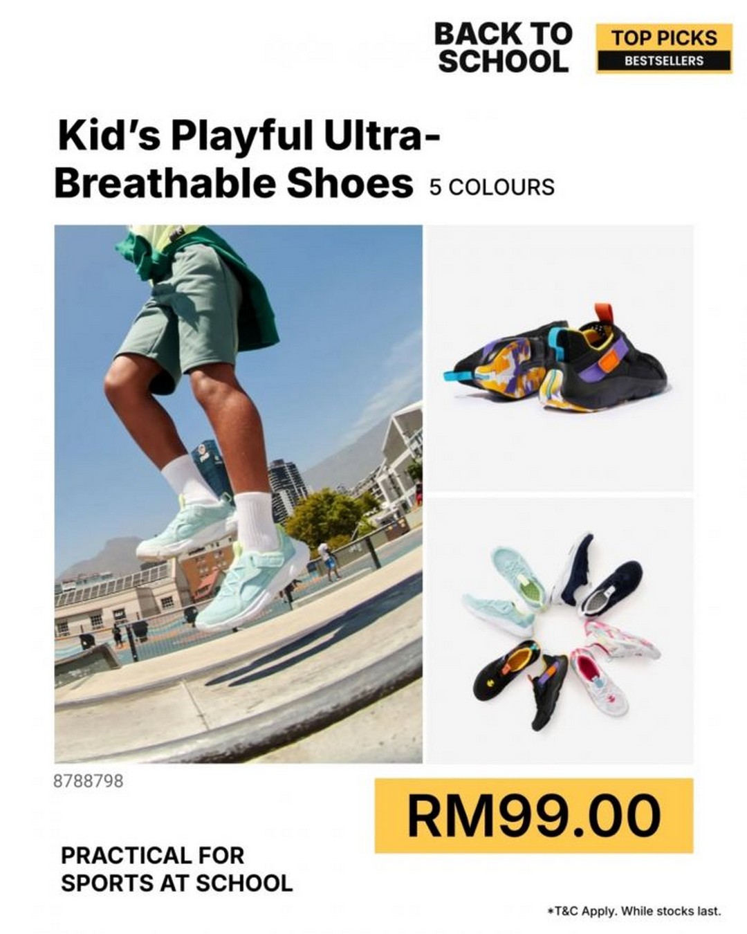 No school gear is complete without shoes and clothing that can withstand a busy school day. Decathlon offers Kid’s Playful Ultra-Breathable Shoes, crafted for comfort and support. Designed for active students, these shoes are perfect for sports, recess, or everyday school activities. Available in five vibrant colours, they retail at RM99, combining practicality with a fun style that children will enjoy.