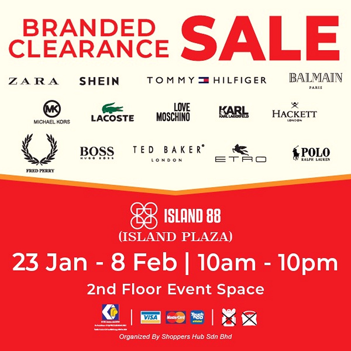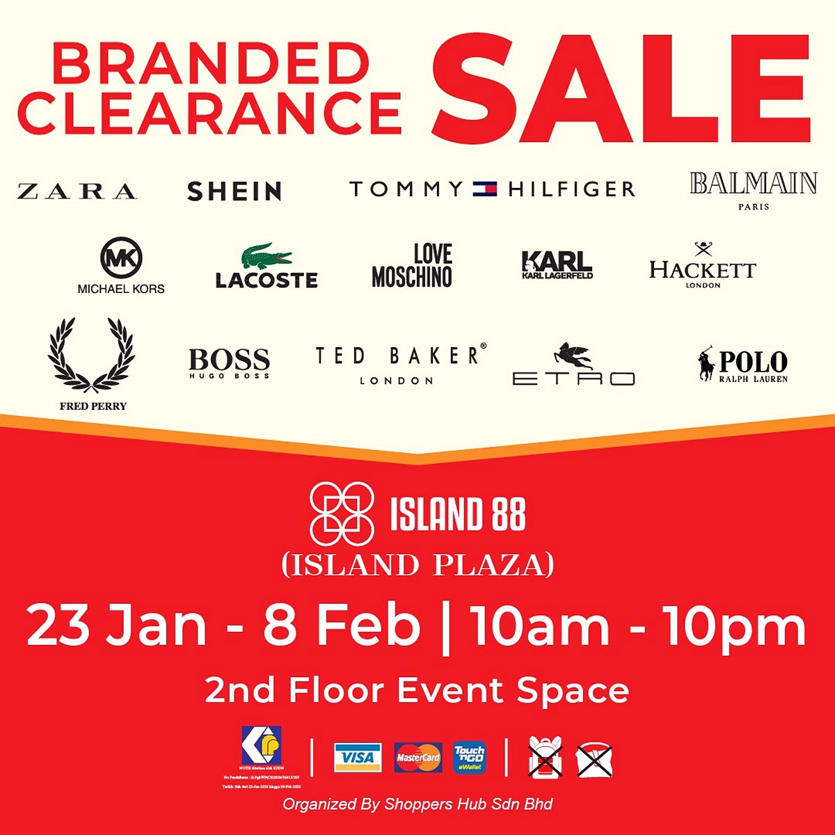 This is not one of those small, blink-and-you’ll-miss-it sales tucked inside a retail corner. This is a full-blown branded clearance event, taking over the 2nd Floor Event Space at Island 88, and it is packed with recognisable international fashion labels. For anyone who enjoys dressing well but prefers paying less, this sale ticks all the right boxes.
