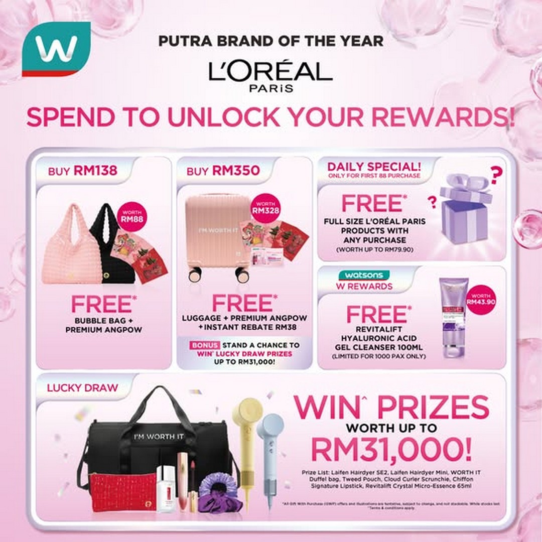 For those who do plan to shop, the rewards become even more attractive. Shoppers who spend up to RM350 during the event can receive a free luggage, a premium angpow and a Watsons RM38 instant rebate voucher. This combination of gifts adds real value to the purchase. A free luggage is not just a novelty item; it is a useful travel essential that many people would otherwise spend hundreds of ringgit on. The premium angpow adds a festive touch, while the Watsons RM38 instant rebate voucher provides savings for future health and beauty purchases at Watsons outlets.