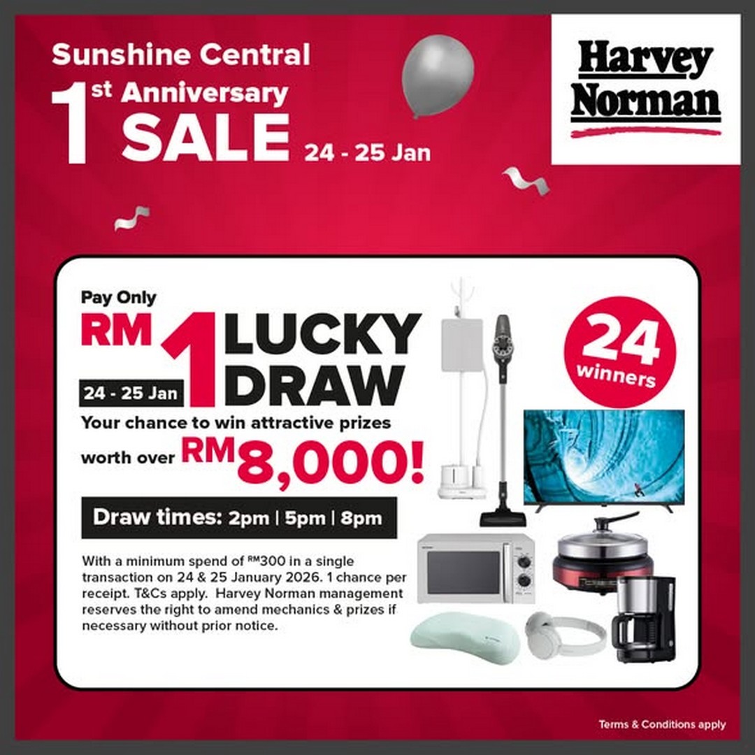 In summary, the Harvey Norman Sunshine Central 1st Anniversary Sale is more than just a shopping event. It’s a celebration of community, of great bargains, and of the joy that comes from finding quality products at unbeatable prices. From massive discounts of up to 80%, to guaranteed prizes and RM1 Lucky Draws worth thousands, to free popcorn and a lively festive atmosphere, there are countless reasons to visit. Whether you are upgrading your home, looking for the perfect gift, or simply want to enjoy a fun day out with family and friends, this anniversary sale promises a rewarding and memorable experience.