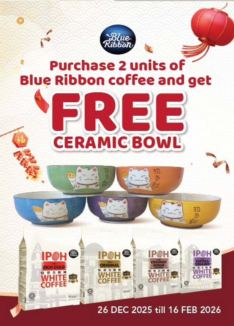 Chinese New Year is just around the corner, and there’s no better way to welcome the festive season than with a steaming cup of coffee. For those who enjoy the rich, smooth taste of local favourites, BlueRibbon Ipoh White Coffee has launched an irresistible promotion that coffee lovers will not want to miss. From 26 December 2025 to 16 February 2026, buying two packs of BlueRibbon White Coffee at selected AEON outlets will reward shoppers with a free ceramic bowl, adding a little extra joy to their CNY celebrations.