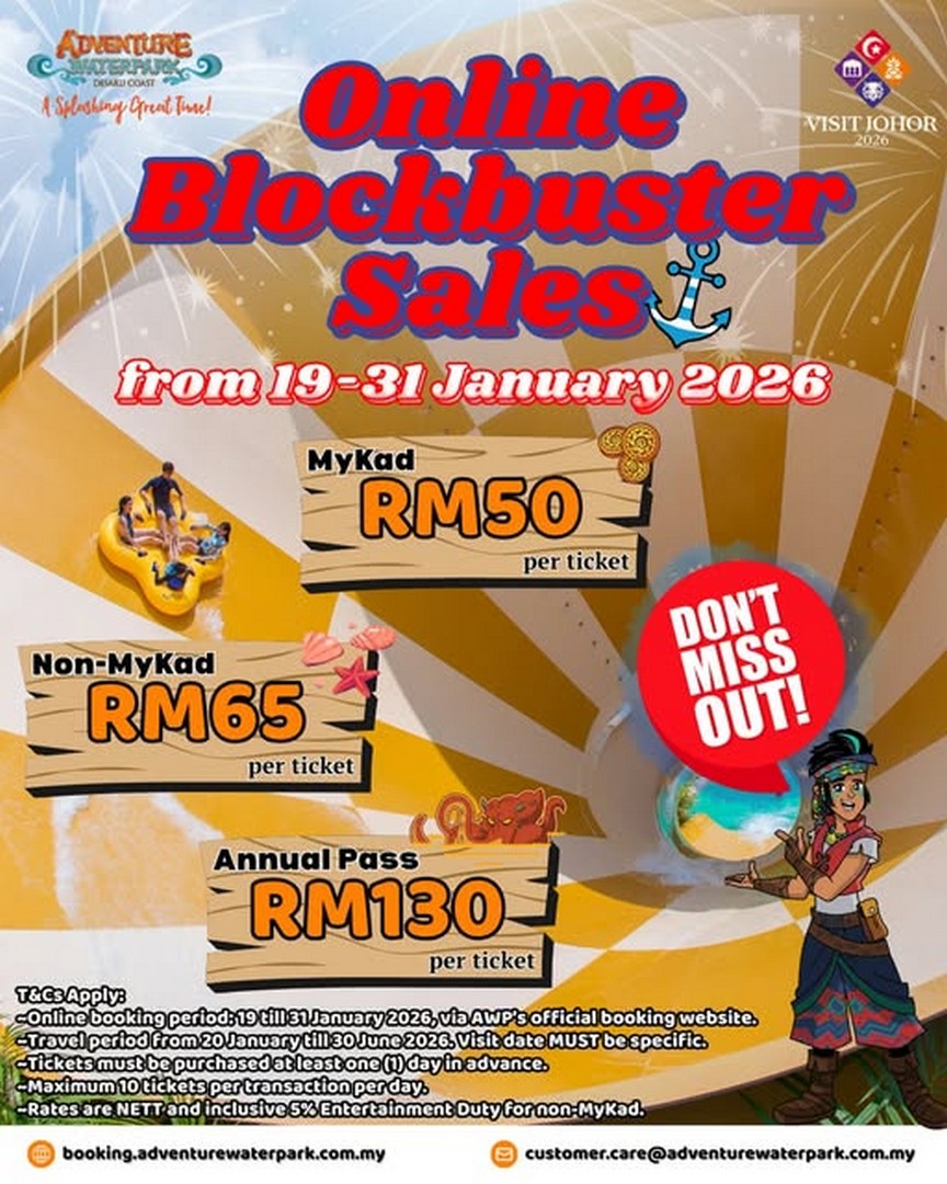 For residents of Johor, visitors from neighbouring states, or tourists planning a getaway, this is the perfect chance to explore the park while taking advantage of significant savings. With the sale running only until 31 January 2026, there’s no time like the present to plan a memorable visit to Adventure Waterpark Desaru Coast.