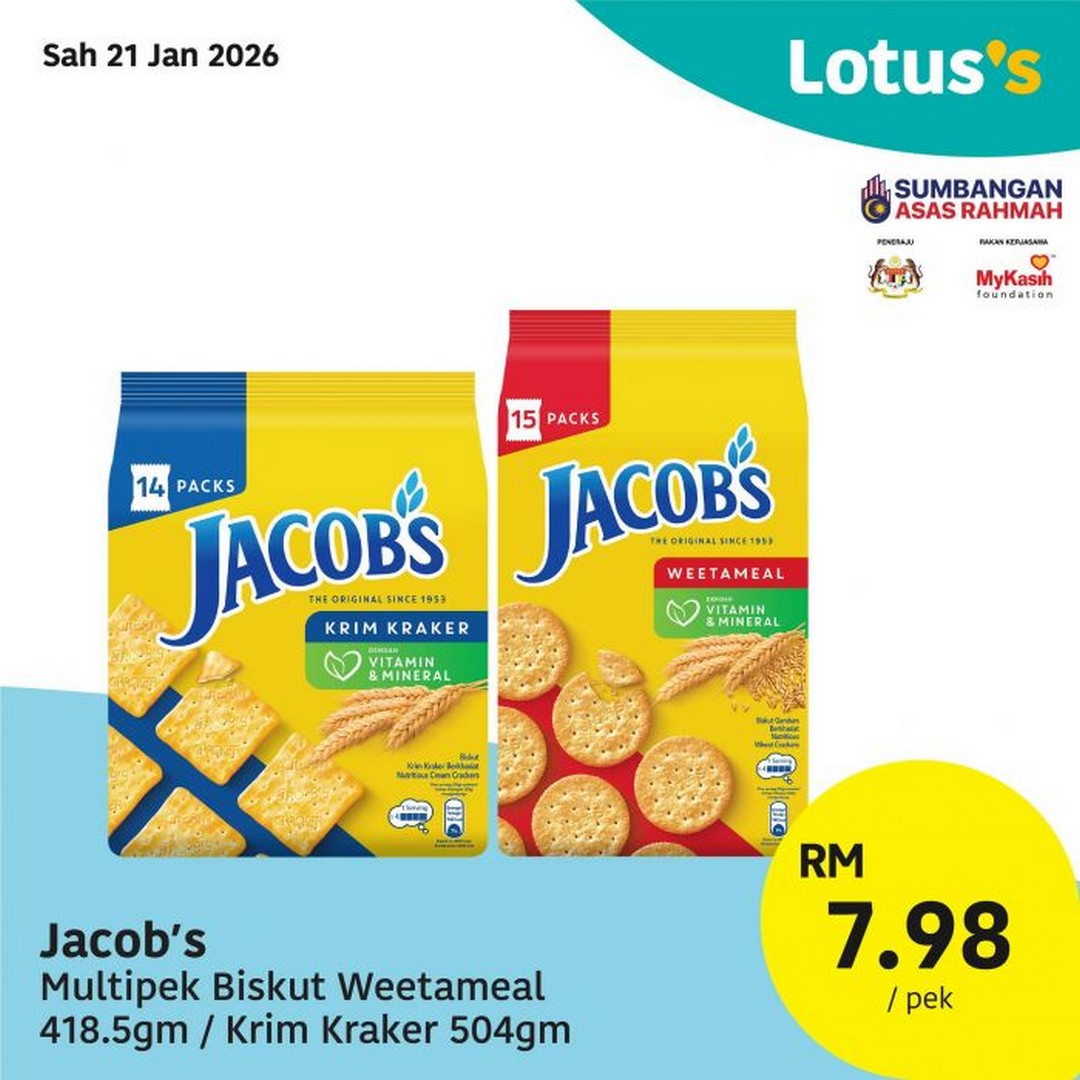 Jacob’s Biscuits (Weetameal 418.5gm / Cream Cracker 504gm): RM 7.98 per pack – Ideal for tea time, school snacks, or light bites during work breaks.