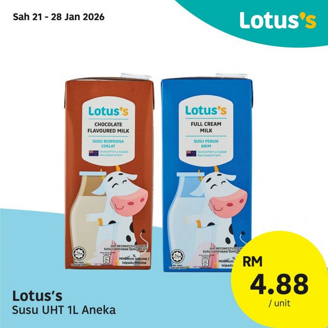 Lotus’s UHT Milk 1L (Full Cream / Chocolate): RM 4.88 per unit – Perfect for breakfast cereals, coffee, or simply enjoying a glass of cold milk.