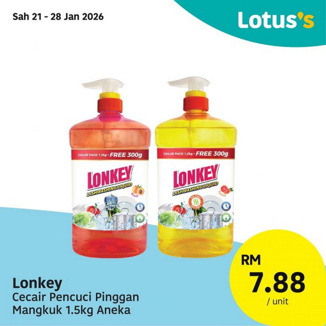 Lonkey Dishwashing Liquid 1.5kg (Assorted): RM 7.88 per unit – Keep your kitchen sparkling clean without splurging on expensive detergents.