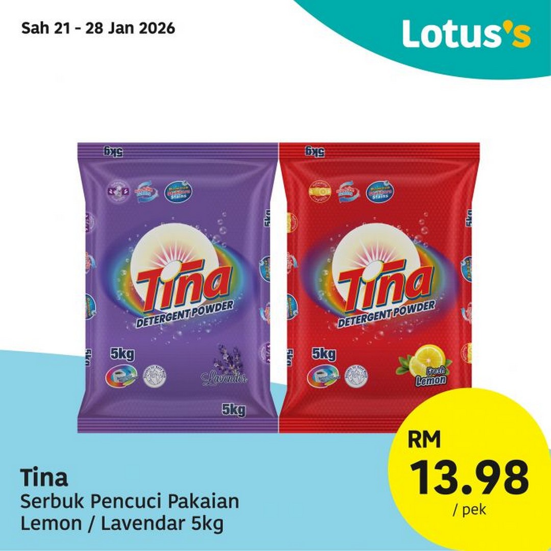 Tina Detergent Powder 5kg (Lemon / Lavender): RM 13.98 per pack – Efficient cleaning power at a price that stretches your Ringgit further.