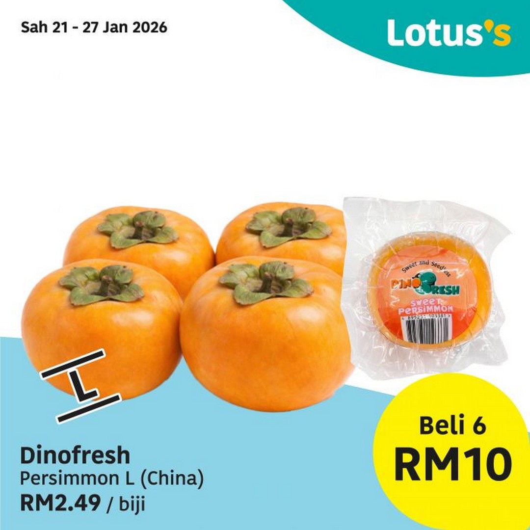 Dinofresh Persimmon L (China): Buy 6 for RM 10.00 (Normal Price: RM 2.49 per fruit) – Sweet and juicy, perfect for dessert or a healthy snack for the kids.