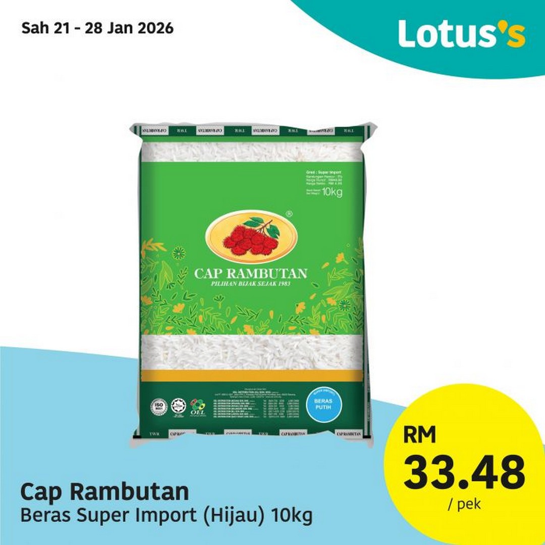 Cap Rambutan Super Import Rice (Green) 10kg: RM 33.48 per pack – Reliable quality rice is a must in every Malaysian home, and this offer makes it affordable for large families.