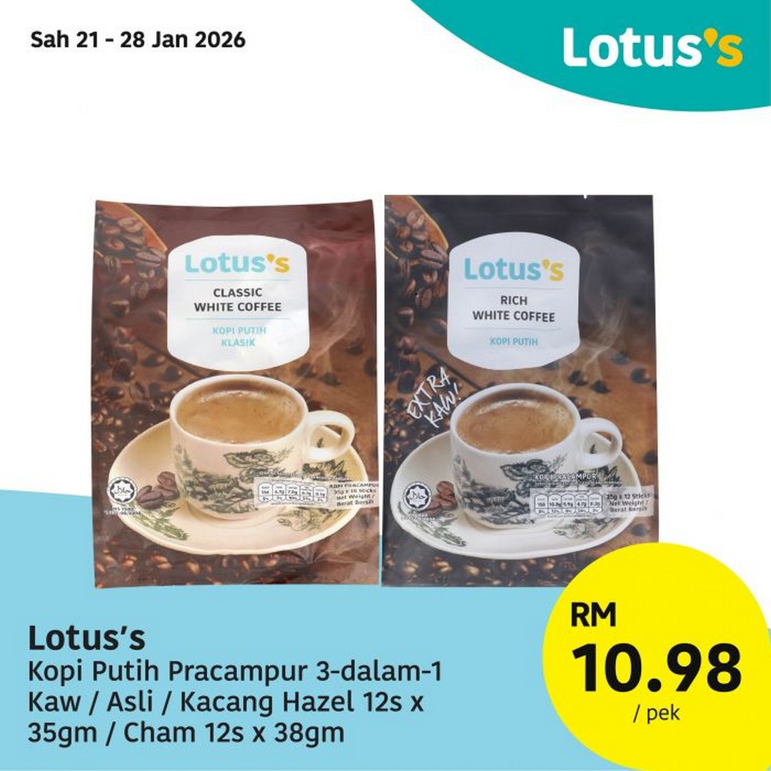 Lotus’s 3-in-1 White Coffee (Kaw / Asli / Hazelnut 12s x 35gm / Cham 12s x 38gm): RM 10.98 per pack – A quick and convenient beverage option for busy mornings or an afternoon pick-me-up.