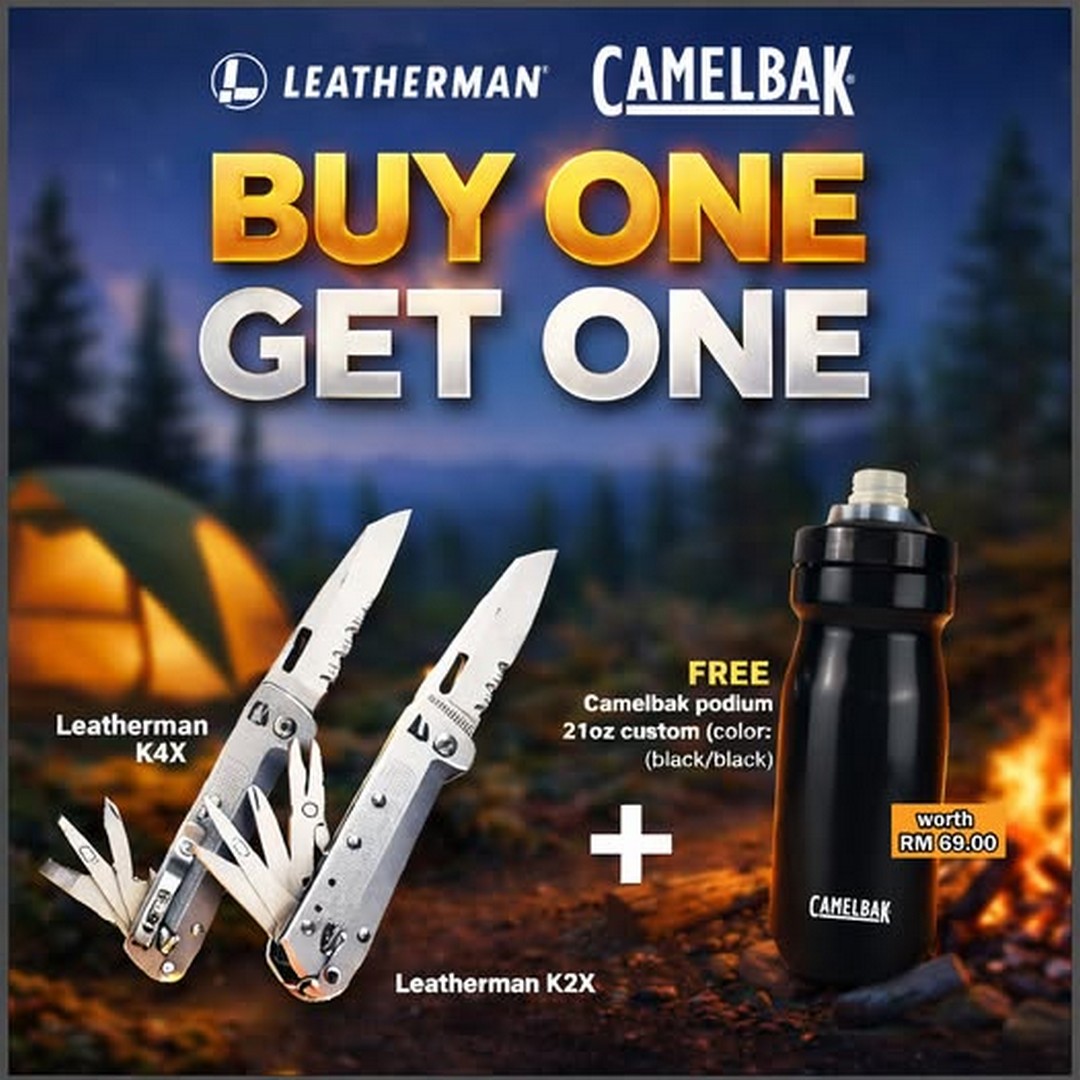 From 21 January 2026 onwards, GoOutdoor is running a straightforward yet highly attractive promotion. Customers who purchase a Leatherman K4X or K2X will receive a FREE CamelBak Podium 21oz bottle, worth RM69. There are no complicated steps, no redemption forms, and no hidden catches. Buy the tool, and the hydration bottle comes with it, while stocks last.
