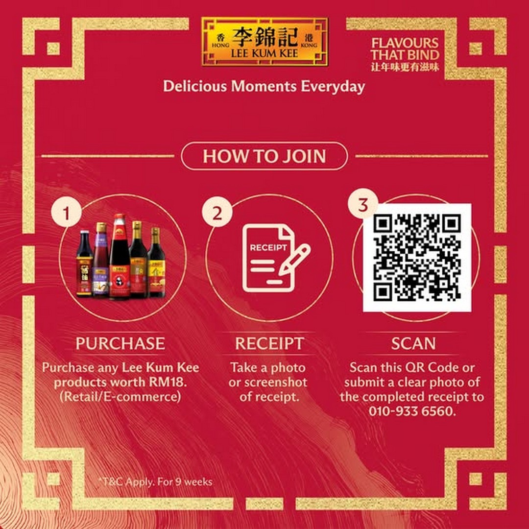Purchase any Lee Kum Kee products worth RM18 or more. This includes products purchased from retail stores or through online e-commerce platforms, making it convenient for everyone. Whether them prefer to shop in-store or from the comfort of their home, participation is hassle-free.