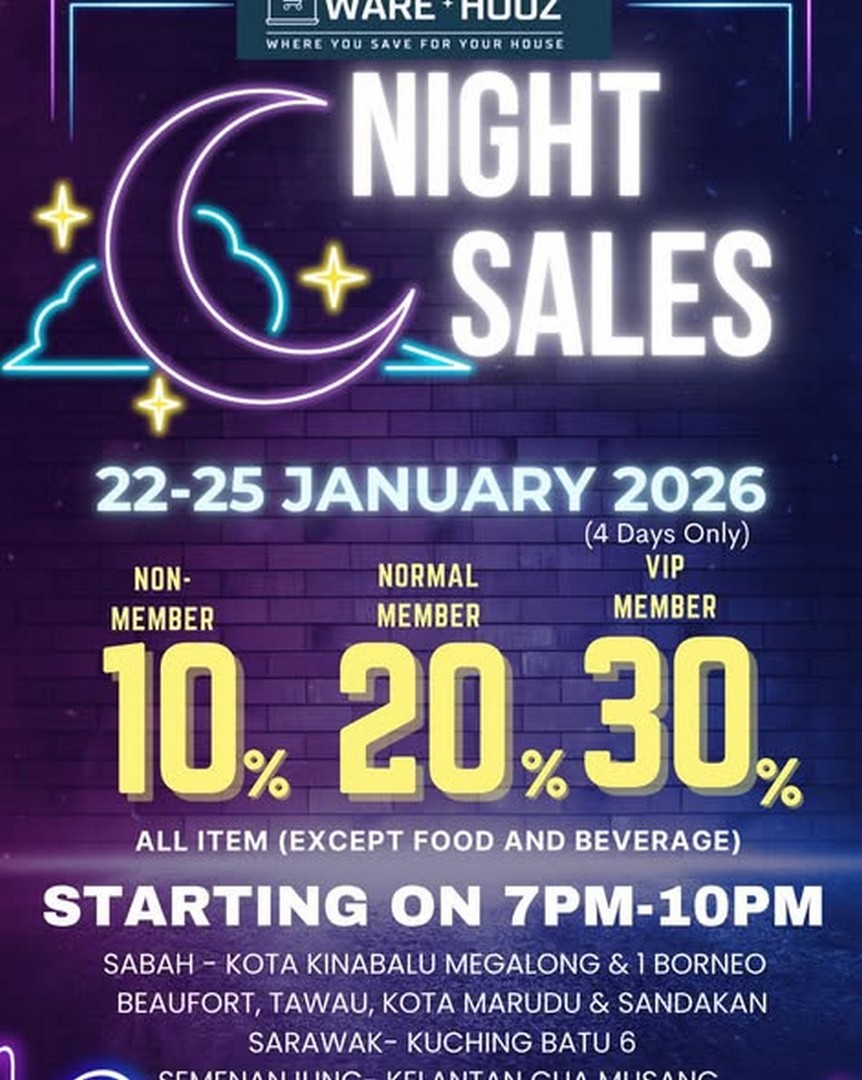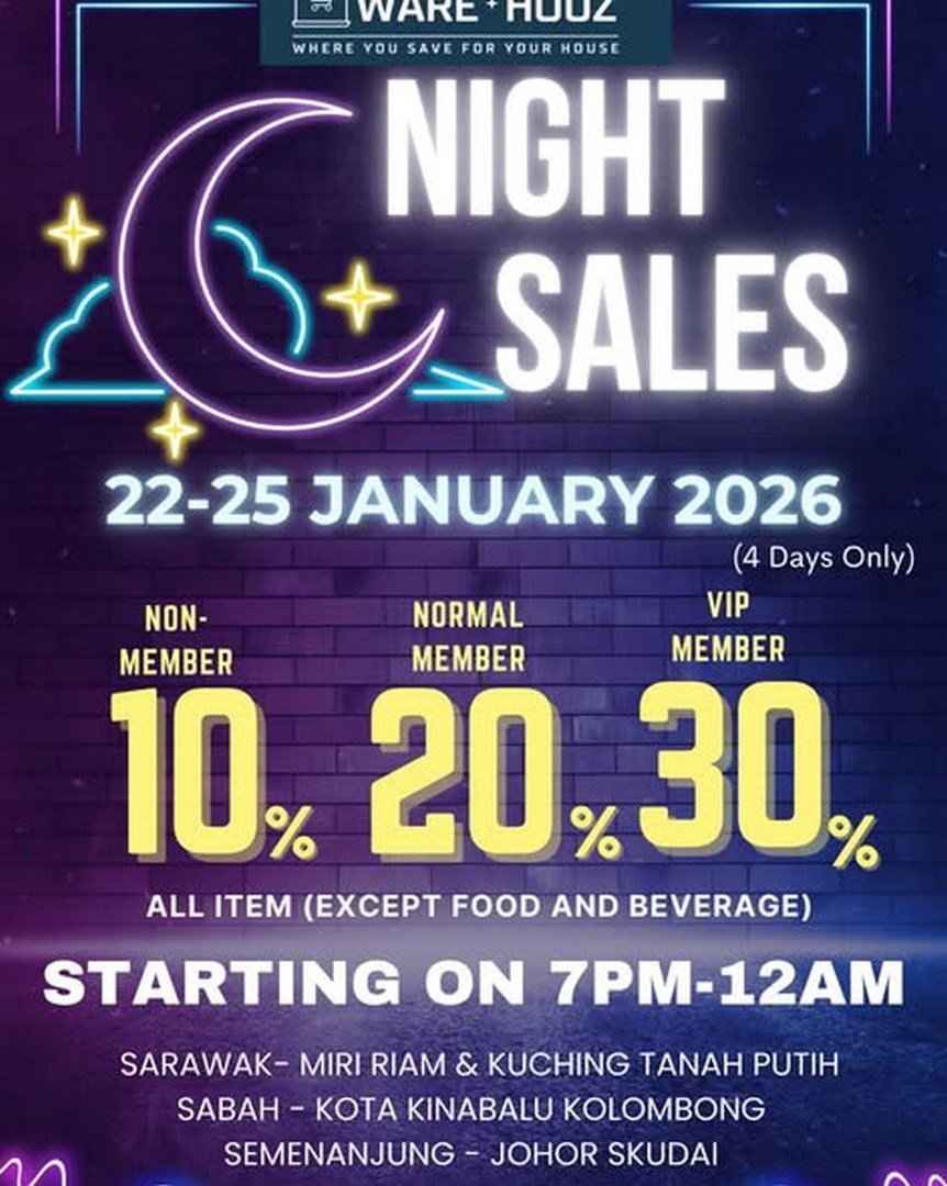 In conclusion, the WareHouz Night Sale from 22–25 January 2026 offers more than just discounted prices. It provides a unique shopping experience tailored for night owls, a wide range of member benefits, and an opportunity to discover high-quality products at unbeatable prices. Whether you’re a regular shopper or a first-timer, attending this event promises savings, convenience, and a genuinely enjoyable shopping experience. With multiple locations across Malaysia and even in Miri, everyone has a chance to participate and make the most of these exclusive discounts.
