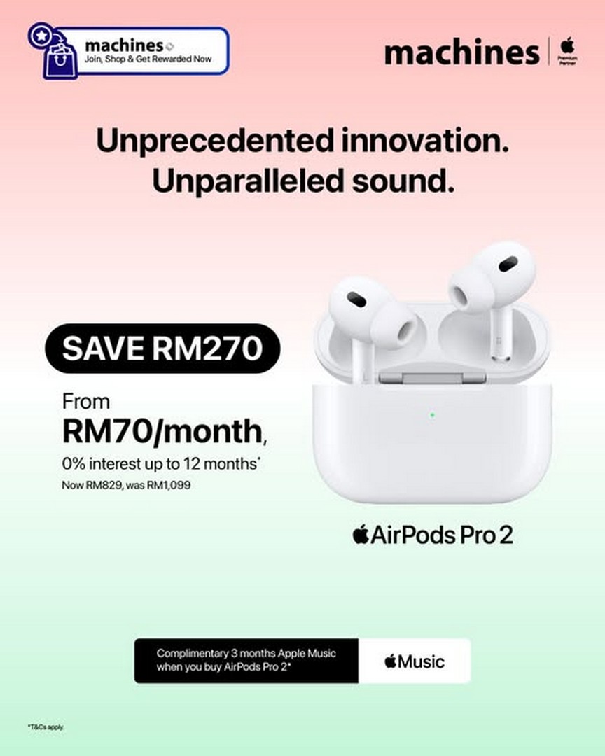 In summary, Machines’ AirPods Pro 2 promotion is more than just a price drop—it’s a carefully curated bundle of financial convenience, added perks, and technological enhancement. From the substantial RM270 discount to 0% interest installment plans, three months of Apple Music, loyalty point redemptions, and an inclusive trade-in programme, it’s clear that Machines has structured this deal with the consumer in mind. It’s a perfect moment for anyone seeking a premium audio experience while enjoying maximum value for their money.