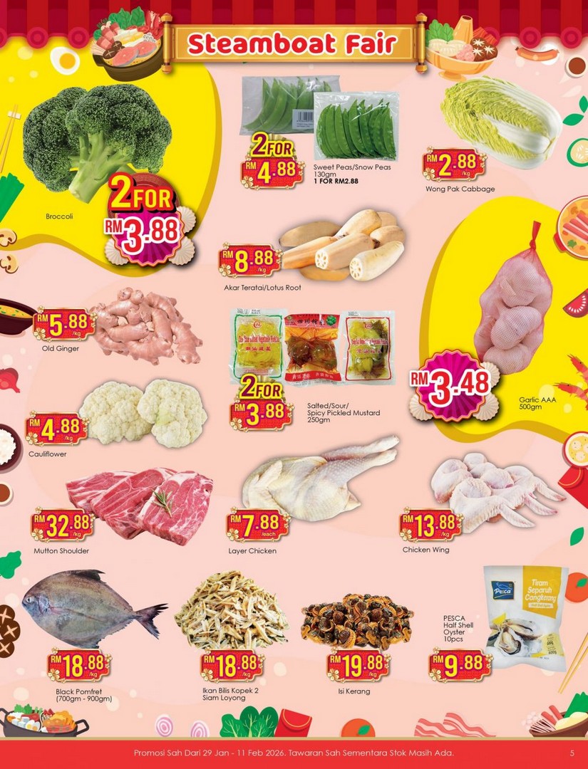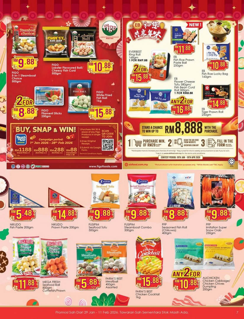 No Chinese New Year celebration is complete without a delicious reunion dinner. TF Value-Mart’s “Happiness Together” promotion includes excellent deals on fresh market items and steamboat ingredients, allowing families to enjoy a feast without stretching their budgets. Broccoli is offered at 2 for RM3.88, while sweet peas and snow peas (130gm) are available at 2 for RM4.88. Mushrooms are also included, with enoki mushrooms (100gm) priced at 3 for RM1.88 and king oyster mushrooms (200gm) at 2 for RM3.88, perfect for hearty soups and hot pots. Meat and seafood are also well-represented, with EB Ring Roll (168gm) at 2 for RM15.88, Figo Steamboat Choice 5-in-1 (500gm) at RM9.88, mutton shoulder at RM32.88/kg, and Pesca half shell oysters (10pcs) at RM9.88. These offers ensure families can prepare a variety of dishes without compromising on quality.