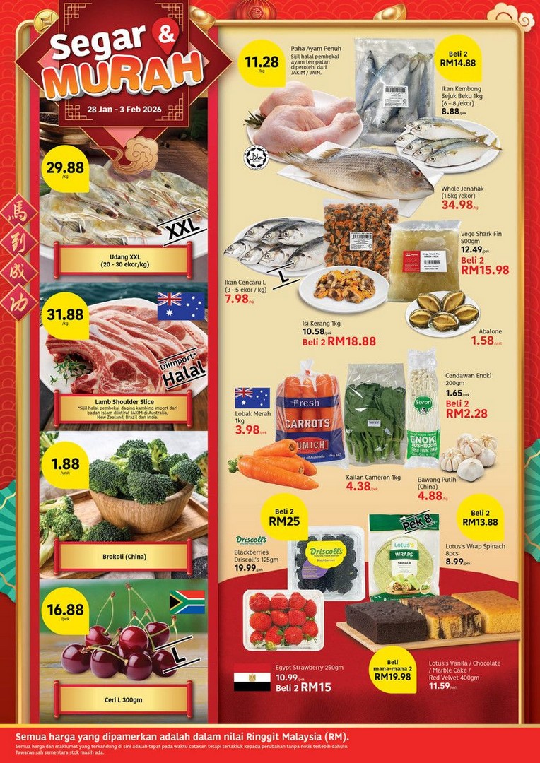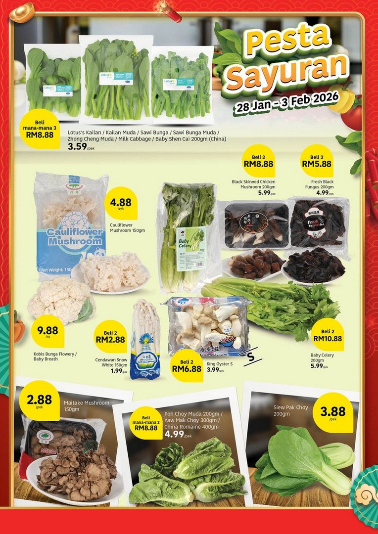 Vegetable lovers are also in for a treat. Broccoli from China is only RM1.88 per unit, while Cherry L (300gm) packs are available for RM16.88 per pack, giving them flexibility to prepare fresh, vibrant dishes for their festive table. For those who love to buy in bundles, Lotus’s Kailan, Sawi Bunga, or Milk Cabbage are available in a “buy any 3 for RM8.88” offer, valid from 28 January to 3 February 2026. They can also get Cauliflower Mushroom (150gm) for just RM4.88 per pack, ensuring a range of greens and vegetables to brighten up any meal.