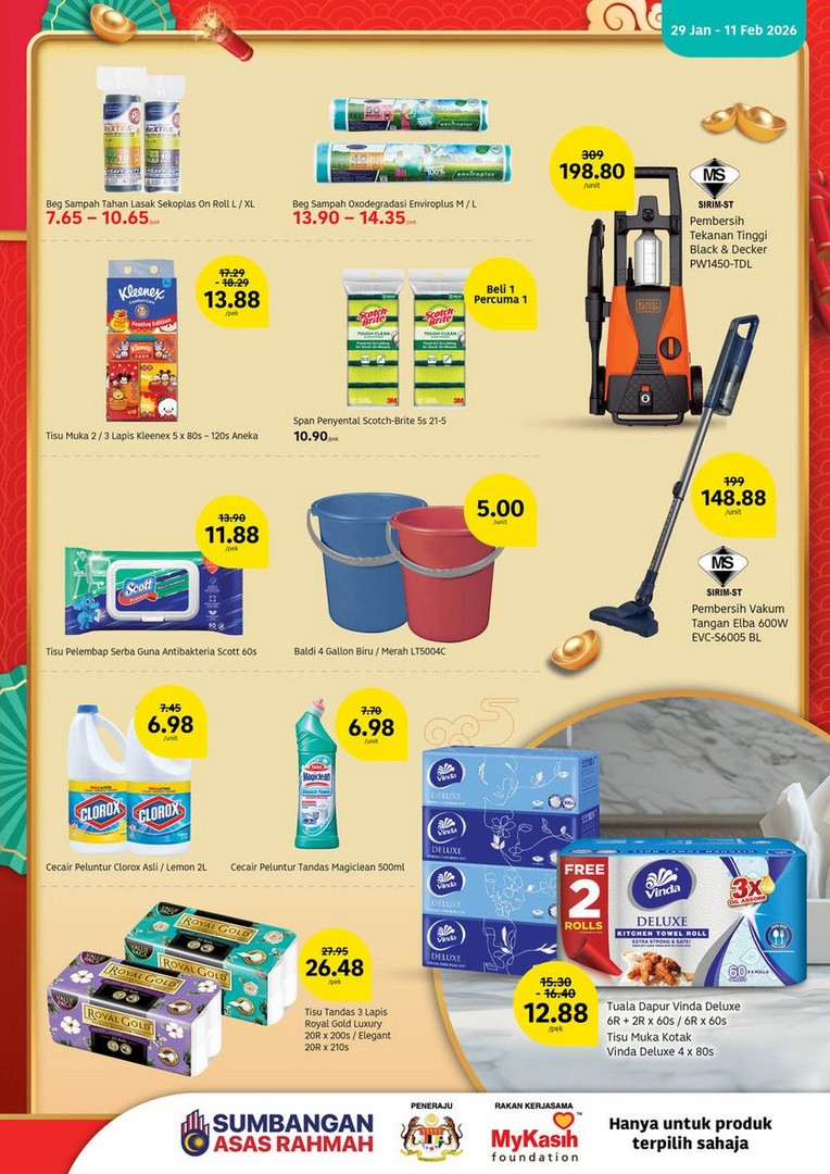 Instant meals and convenience foods are also part of the promotion. Maggi 2-Minute Noodles (Curry/Chicken, 5 packs) are priced at just RM4.48 per pack, making them a quick and easy meal option when preparing multiple dishes. For laundry needs during the busy season, Daia Washing Powder (2.1kg/2.3kg) is offered at RM12.48 per pack, helping them keep their home spotless for guests.