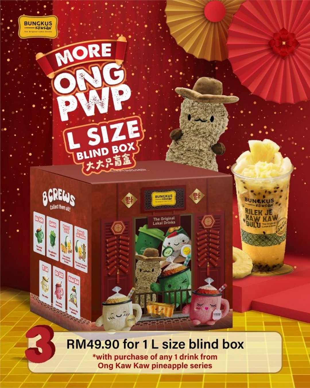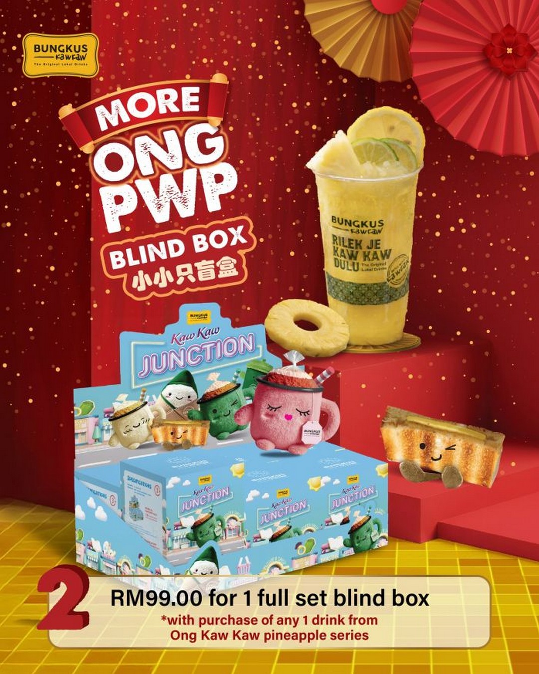 What truly elevates this campaign, however, is the festive giveaway element. Chinese New Year traditions often involve angpao, and Bungkus Kaw Kaw has creatively reimagined this tradition by offering a FREE Limited Edition Plushie Angpao, worth RM9.90, with the purchase of any two cups from the Ong Kaw Kaw Pineapple Series. This is not just a simple freebie, but a themed collectible designed to match the festive spirit.