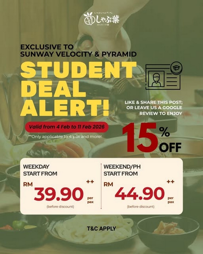 The promotion is valid only at SHABU-YO Sunway Velocity and SHABU-YO Sunway Pyramid, both of which are located in popular shopping destinations with easy access to public transport. These locations are particularly convenient for students, whether they are studying nearby or simply meeting friends for a meal after classes or shopping.