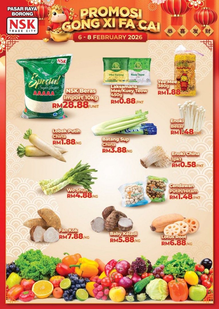 Chinese New Year is just around the corner! Are they ready for the big reunion dinners and festive open houses? If not, NSK Trade City is the ideal one-stop destination to grab all their essentials at unbeatable prices. From 6th to 8th February 2026, NSK Trade City is rolling out a festive shopping bonanza, featuring fresh seafood, vegetables, lokam, festive hampers, and more. With their “Harga Borong” deals and exclusive RM1 Happy Hour, this is the perfect opportunity for families to complete their CNY shopping efficiently without stretching their budget.