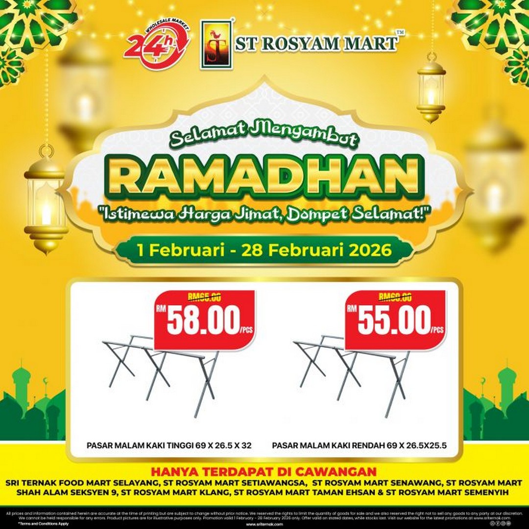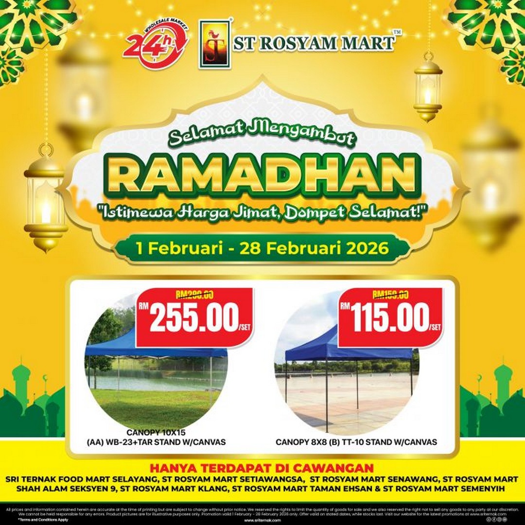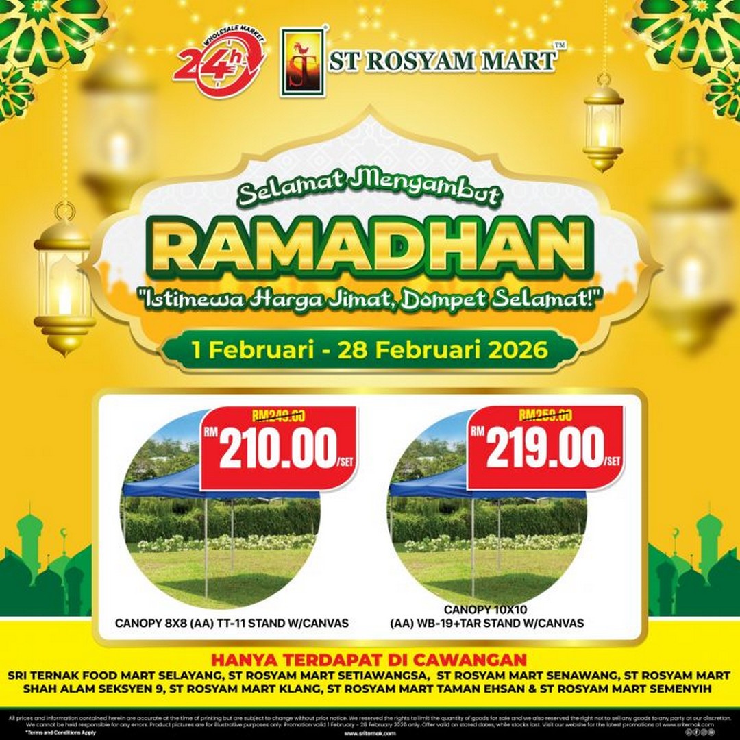 A successful stall begins with a solid setup, and ST Rosyam Mart understands this well. They are offering special prices on sturdy canopies and structural supports that are perfect for outdoor bazaars and night markets. Here are some of the key items available at selected branches: