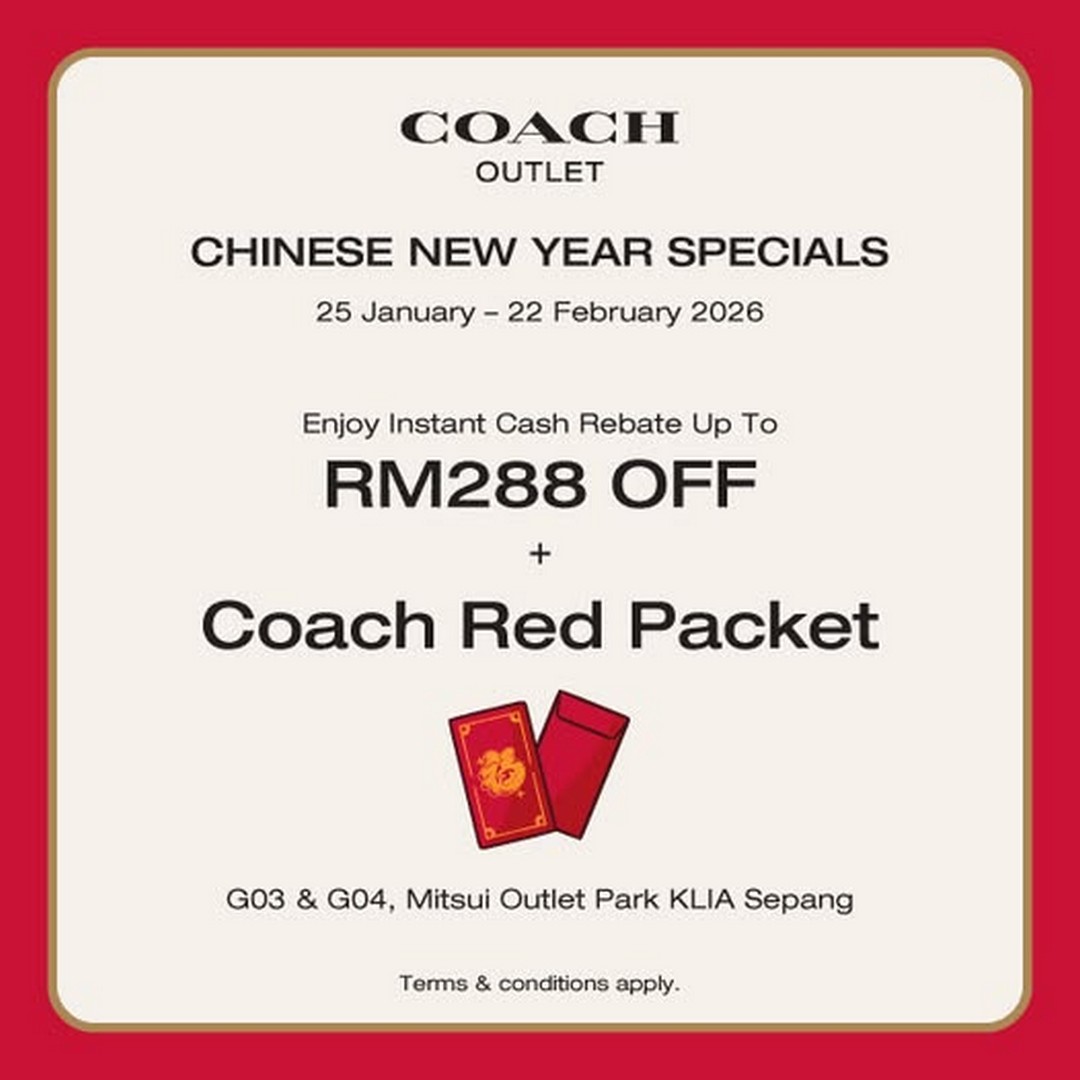 The Chinese New Year season is officially in full swing, and for fashion lovers and savvy shoppers, COACH has rolled out an exciting promotion that’s hard to resist. From now till 22 February 2026, shoppers at the COACH Outlet in Mitsui Outlet Park KLIA Sepang can enjoy up to RM288 off their purchases, coupled with a complimentary COACH Red Packet — a festive touch that perfectly captures the spirit of the Lunar New Year.