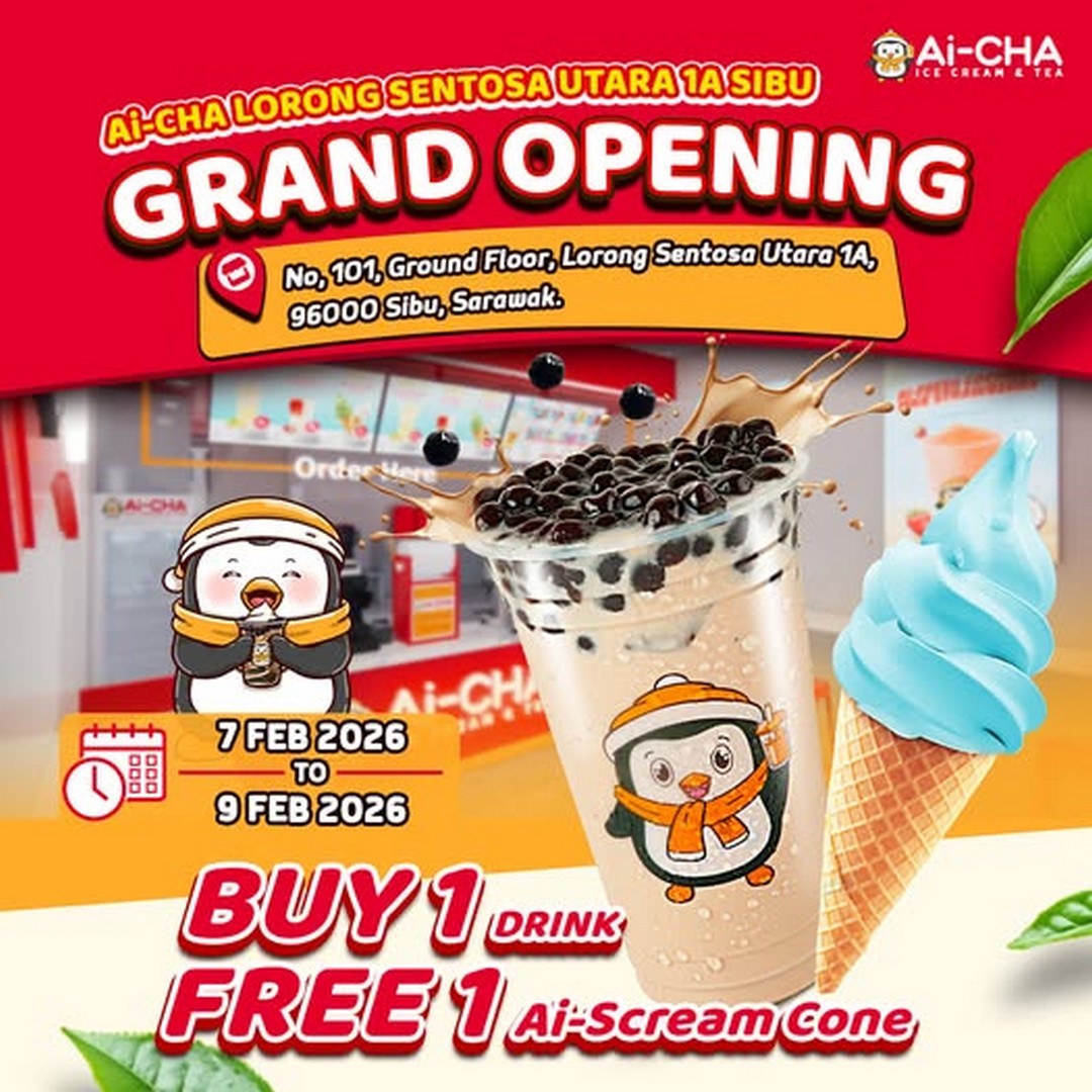 If you happen to be in Sibu this early February, there’s a treat that’s simply too good to miss. Ai-CHA Malaysia, a popular beverage and dessert brand, is opening its newest outlet at Lorong Sentosa Utara 1A, and they’re rolling out a special promotion to celebrate their grand opening. From 7th to 9th February 2026, anyone who purchases a drink at the new store will receive a complimentary ice cream cone. It’s the perfect opportunity to enjoy a refreshing beverage while indulging in a sweet, creamy treat at no additional cost.