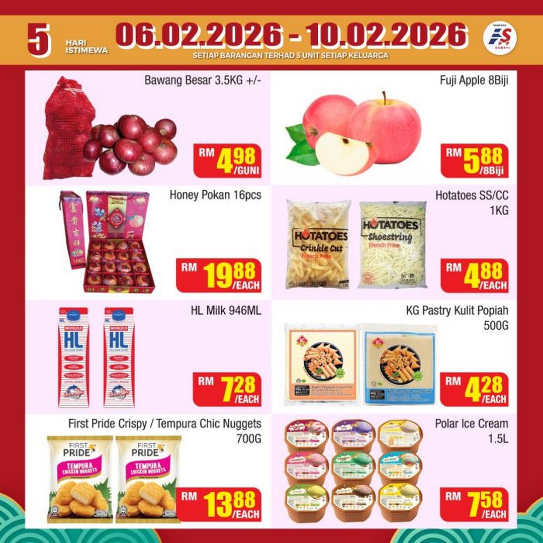 Frozen and chilled goods play an increasingly important role in modern households, especially when time is limited. First Pride Crispy or Tempura Chicken Nuggets (700g) are priced at RM13.88, offering a quick solution for snacks or casual meals. KG Pastry Kulit Popiah (500g) at RM4.28 is ideal for making fresh spring rolls, while Hotatoes Shoestring or Crinkle Cut Fries (1kg) at RM4.88 provide crowd-pleasing sides for both children and adults. Dessert is covered too, with Polar Ice Cream (1.5L) at RM7.58 and HL Milk (946ml) at RM7.28.