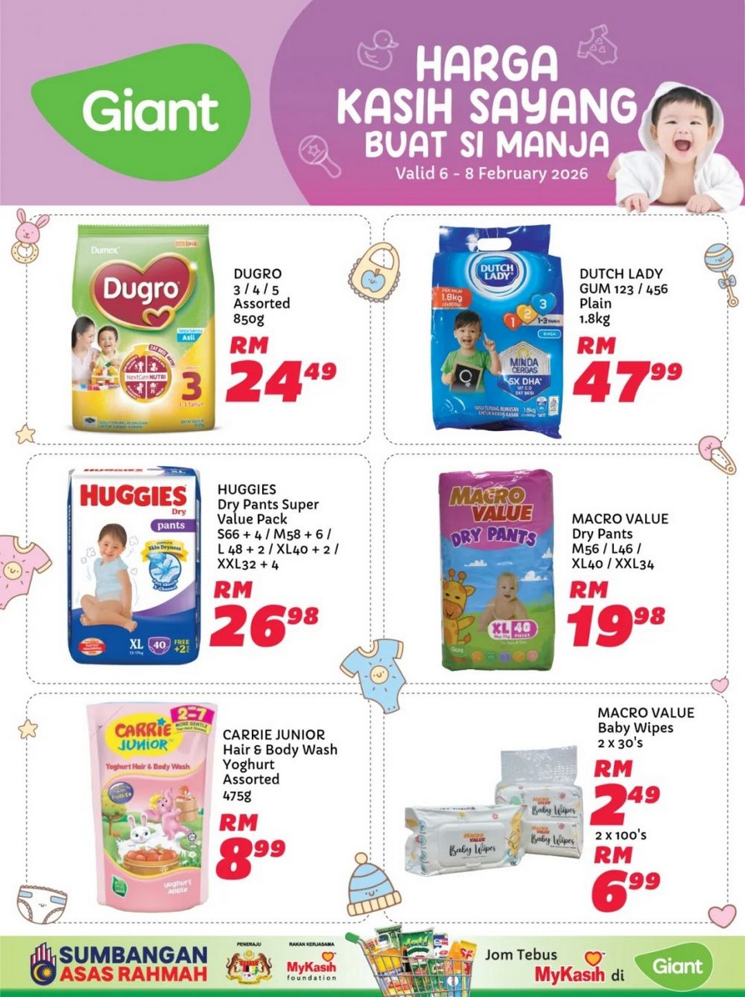 Giant doesn’t just focus on food—household and personal care items are also included in the promotion. TOP Liquid Detergent Assorted (3.6kg) is RM 17.88, Huggies Dry Pants Super Value Pack is RM 26.98, and Dutch Lady Gum 123/456 Plain (1.8kg) is RM 47.99. Dugro 3/4/5 Assorted (850g) is RM 24.49. Haircare and oral care products are also covered with Head & Shoulder Shampoo (300ml) at RM 11.88 and Colgate Toothpaste (2 x 175g) at RM 13.98. Even baby wipes, like Macro Value Baby Wipes (2 x 30’s), are included at just RM 2.49.