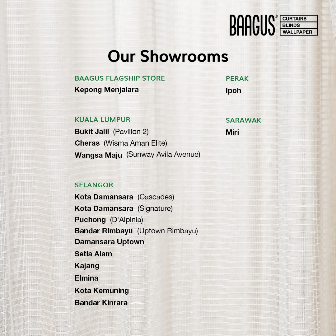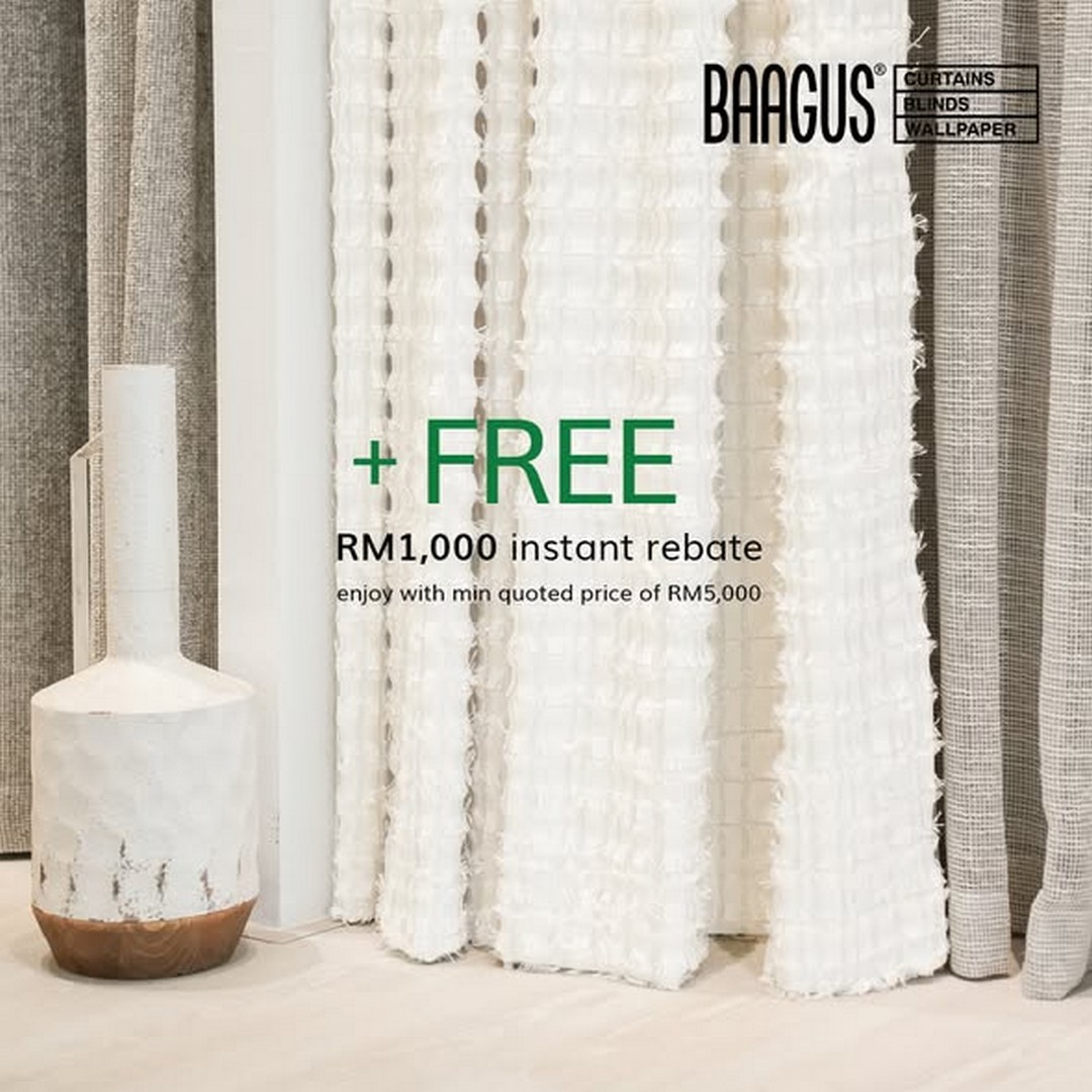 Venue: BAAGUS Curtains showrooms nationwide, including Kepong (Flagship Store), Kota Damansara (Cascades), Bukit Puchong (D’Alpinia), Bukit Jalil (Pavilion 2), Cheras (Wisma Aman Elite), Kajang (Vista Valley), Damansara Uptown, Setia Alam, Kota Kemuning, Wangsa Maju (Sunway Avila Avenue), Bandar Rimbayu (Uptown Rimbayu), Elmina Shah Alam, Miri and Ipoh