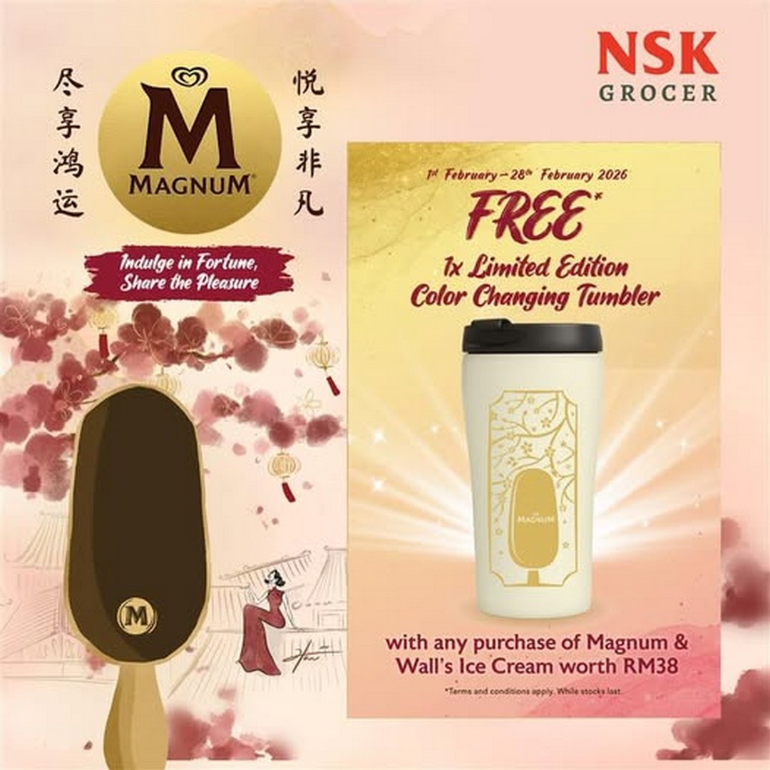 The Lunar New Year is the perfect time to indulge in a little extra sweetness, and NSK Grocer has made it even more tempting for ice cream lovers this year. If you’re planning to treat yourself or your family, this promotion is one you won’t want to miss. NSK Grocer is inviting shoppers to enjoy MAGNUM and Wall’s ice cream while giving a special free gift that’s both fun and practical – a Limited Edition Color-Changing Tumbler.