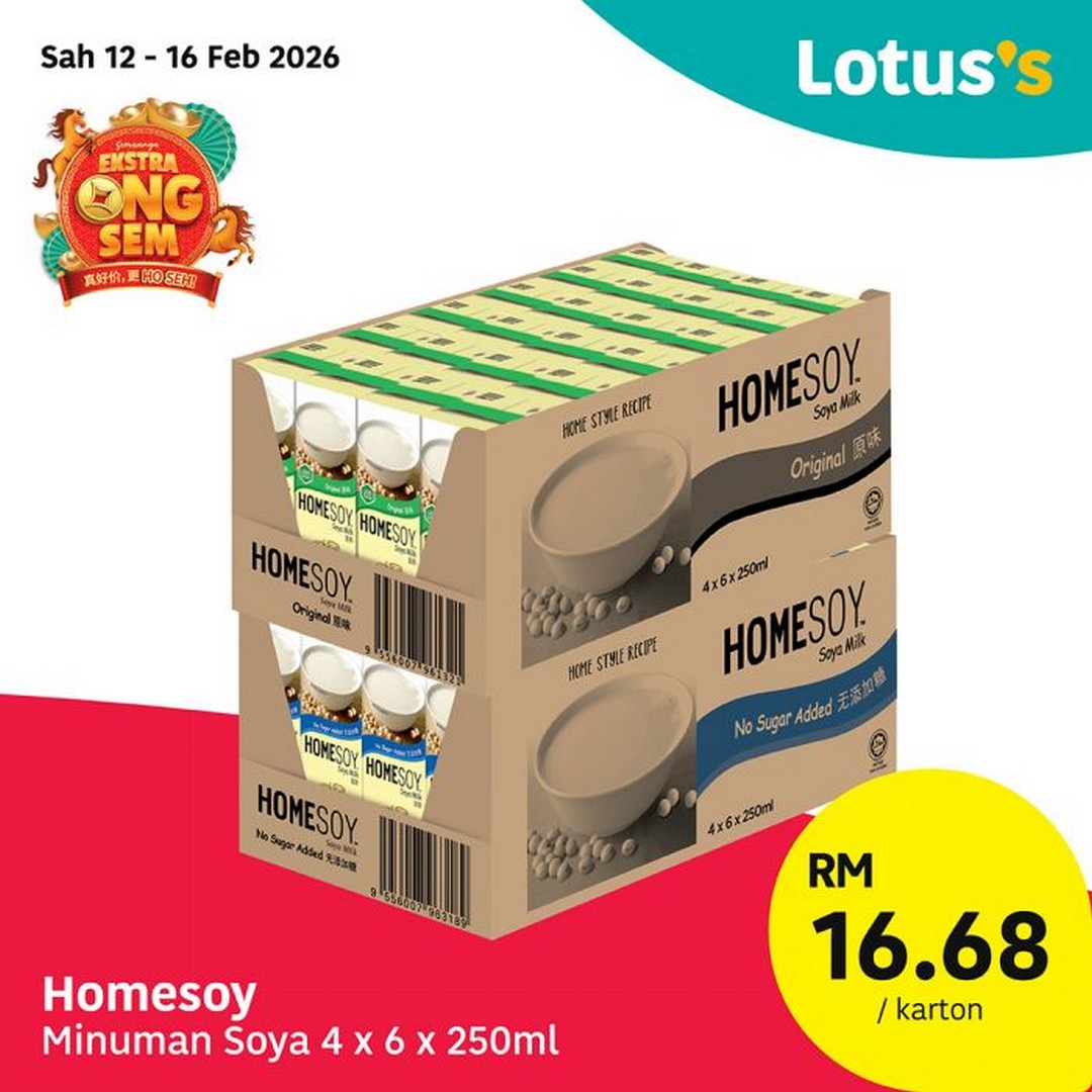 Homesoy Soya Milk (4 x 6 x 250ml), Original / No Sugar Added – RM 16.68 per carton