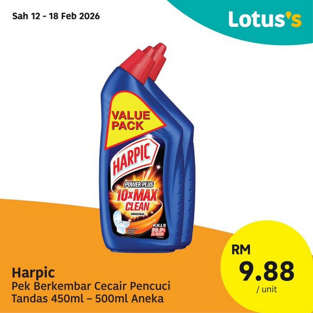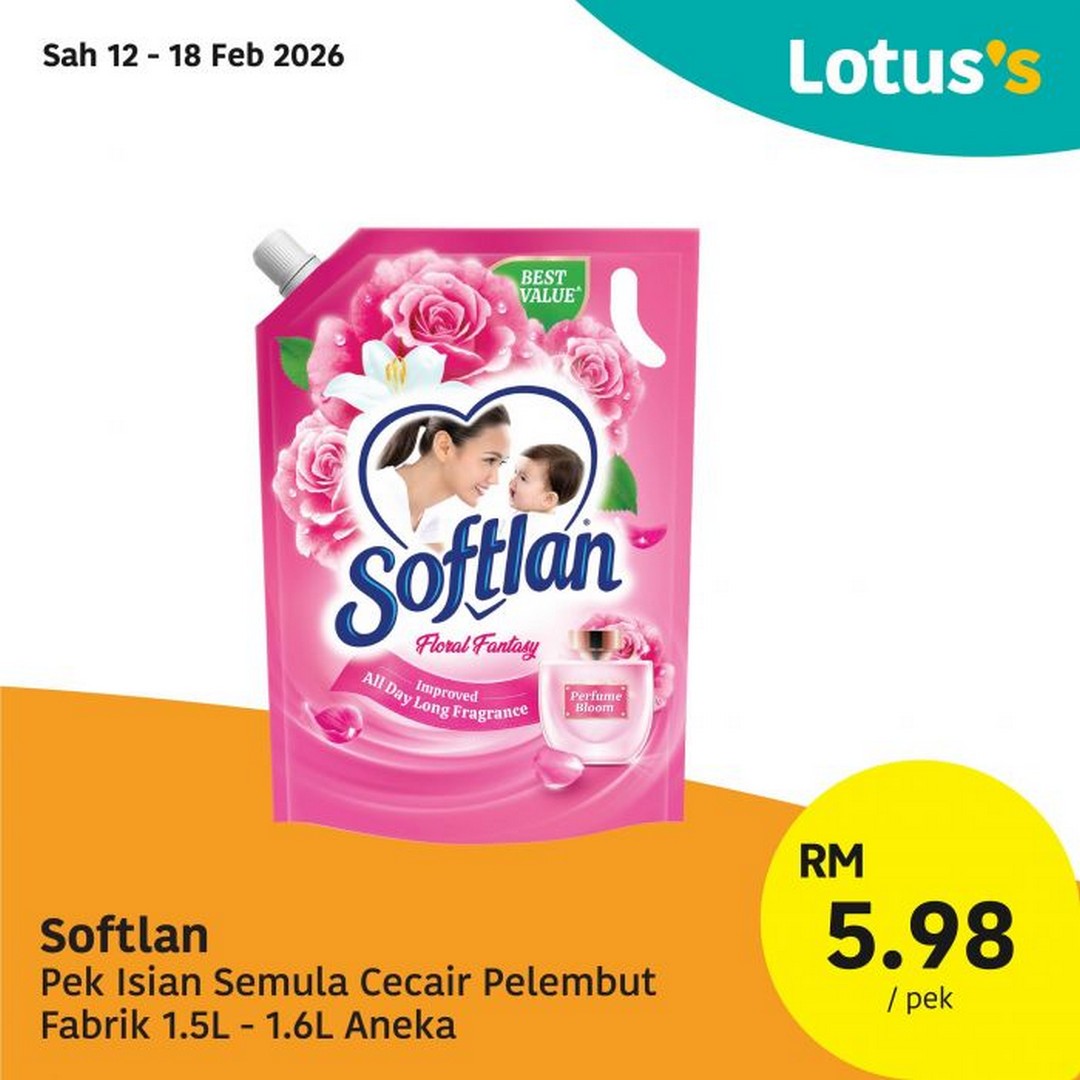 Additionally, laundry essentials are included in the promotion. Bio Zip Serbuk Pencuci Pakaian Aneka (2.3kg) is priced at RM9.78 per pack, while Softlan Pek Isian Semula Cecair Pelembut Fabrik (1.5L – 1.6L Aneka) is just RM5.98 per pack, both available until 18 February 2026. These deals make keeping clothes fresh, soft, and clean more affordable than ever.