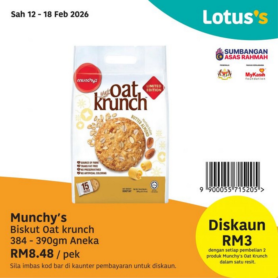 For a healthier snack, the Munchy’s Biskut Oat Krunch Aneka (384 – 390gm) is RM8.48 per pack, and there’s an additional instant saving of RM3 when buying 2 packs in a single receipt. Simply scan the barcode at the payment counter to enjoy the discount, making this an irresistible treat for families looking for value while indulging in a favourite snack.
