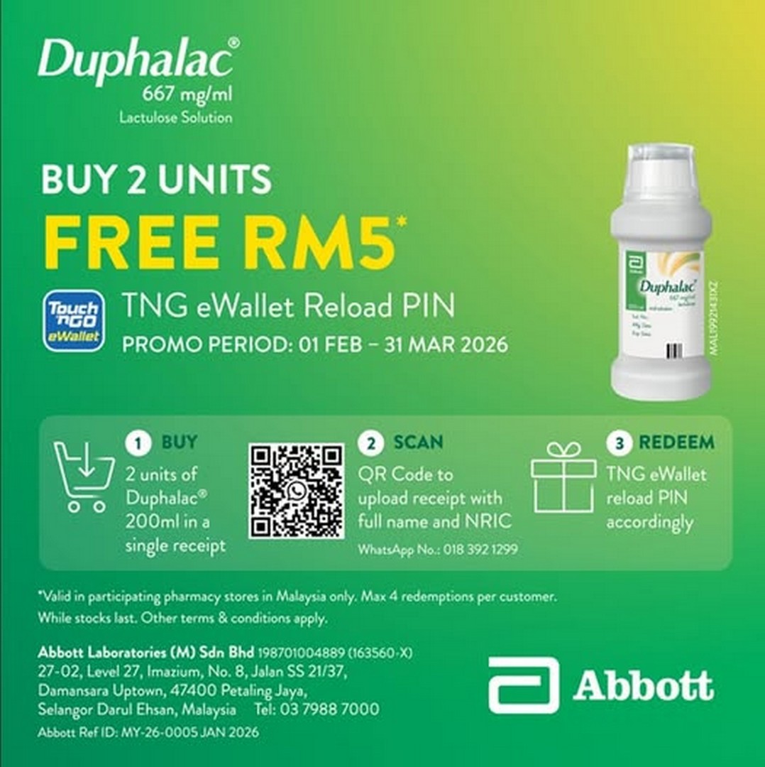 From 1 February to 31 March 2026, shoppers who purchase two units of Duphalac 200ml in a single receipt will receive a FREE RM5 Touch ’n Go eWallet Reload PIN. It sounds simple because it is simple. Buy what is needed, follow a few easy steps, and enjoy a little bonus back in digital cash.