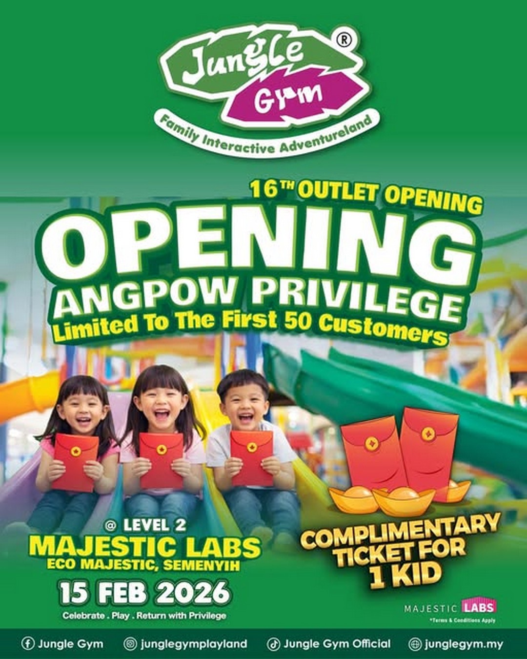 Mark your calendars, plan your arrival, and make sure you’re among the first 50 families to claim your complimentary child ticket. A day filled with climbing, exploring, and festive ANGPOW cheer awaits at Jungle Gym Majestic Labs, Eco Majestic, Semenyih.