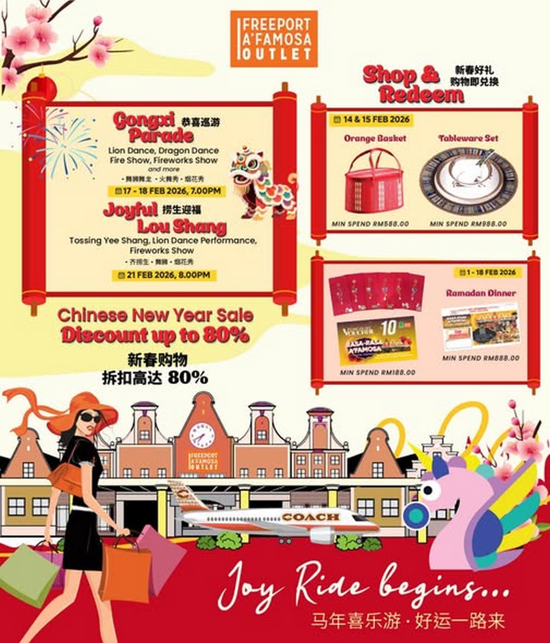 Chinese New Year is the perfect time to indulge in a little retail therapy, and this year, Freeport A’Famosa Outlet is making it irresistible with their “Chinese New Year Joy Ride” promotion. From 17th to 21st February 2026, shoppers can enjoy up to 80% off a wide selection of products while soaking up the festive atmosphere that makes this season so special. For anyone who loves a good bargain or simply wants to enjoy a fun day out with family and friends, this is the ideal opportunity.