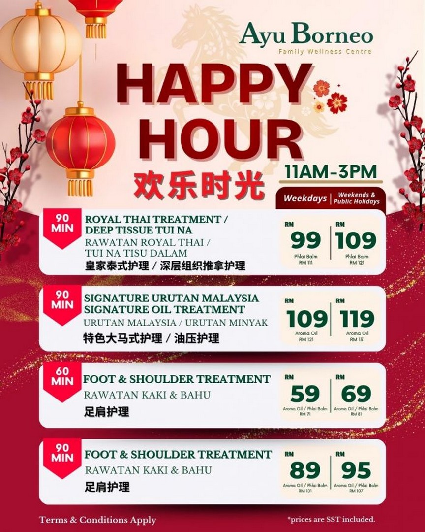The festive season is always a wonderful time to pause, recharge, and indulge in a little self-care, and Ayu Borneo Family Wellness Centre has made it even easier to do just that. As the Chinese New Year celebrations fill homes with laughter, joy, and family gatherings, Ayu Borneo is inviting everyone to take a moment away from the hustle and bustle with their exclusive Happy Hour Promotion. Designed to bring wellness and relaxation to everyone, this promotion is ideal for both those new to therapeutic treatments and regular wellness enthusiasts looking for a quality escape.