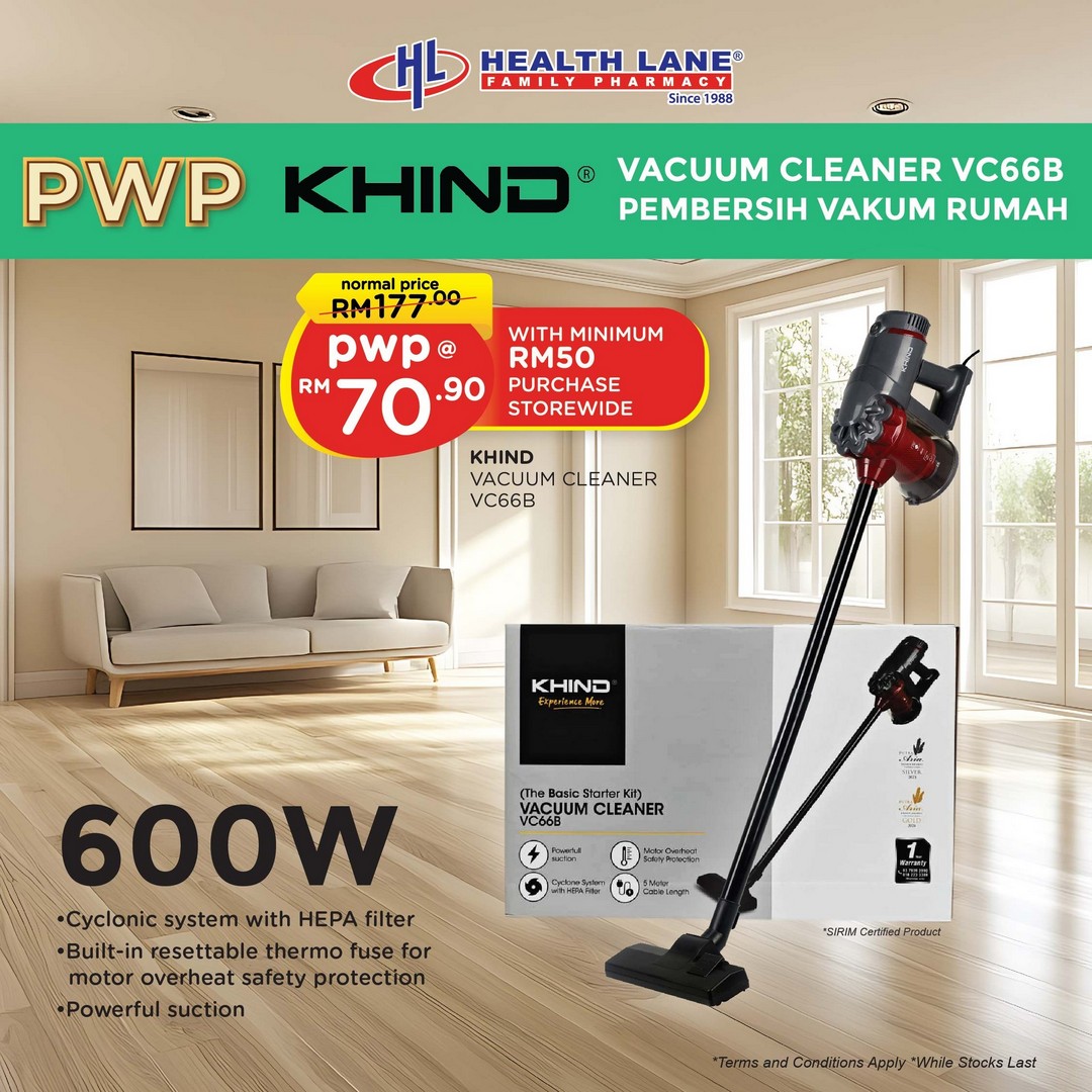 Health Lane Family Pharmacy is also offering special PWP (Purchase With Purchase) deals, such as the KHIND Vacuum Cleaner VC66B for only RM70.90. These offers provide extra value for shoppers who are looking for practical items to bring home for their families during the festive period. -