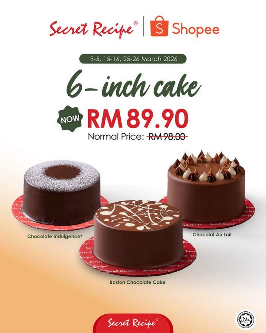 25-26 March 2026, Shopee e-voucher: 6-Inch Cake Promotion, RM89.90, Redeemable at all Secret Recipe outlets in Malaysia