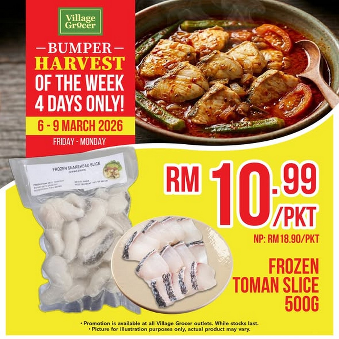 For those who love cooking at home or enjoy fresh seafood without breaking the bank, this coming week is a golden opportunity. Village Grocer, a favourite among shoppers for quality groceries and fresh produce, is bringing back their exciting Bumper Harvest promotion, featuring Frozen Toman Slice 500g at just RM10.99 per packet. Running from 6th to 9th March 2026, this offer is available at all Village Grocer outlets nationwide, making it easy for seafood enthusiasts to stock up without missing out.